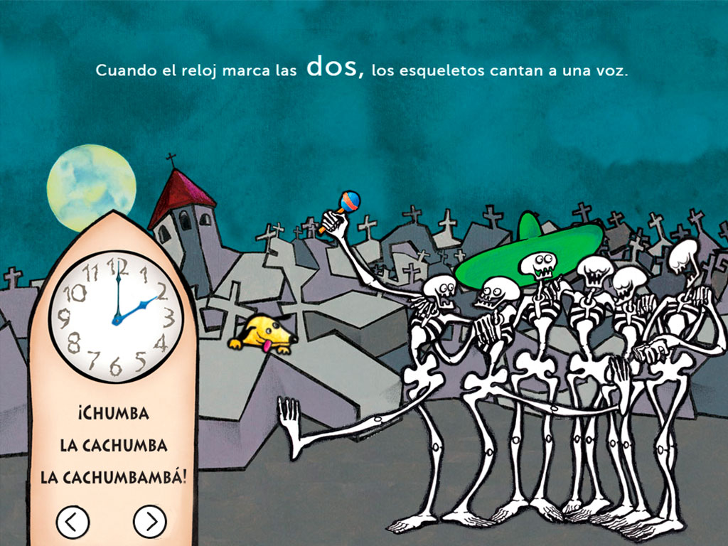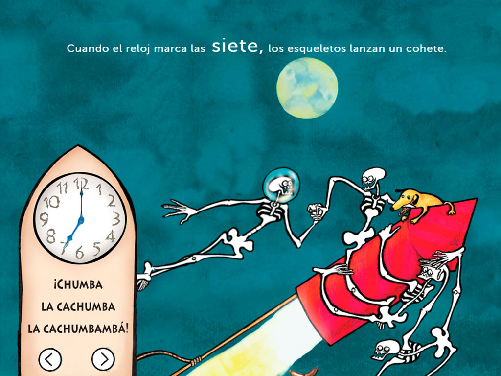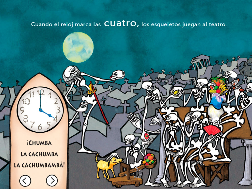 “Cuando el reloj marca la una, los esqueletos salen de la tumba…”. Hora tras hora va creciendo el alboroto en el cementerio hasta que el reloj vuelve a marcar la una y los esqueletos vuelan a la luna. Este libro es una fiesta visual y una genial manera de aprender a contar y a cantar la hora.