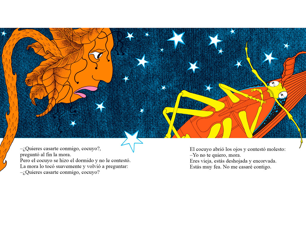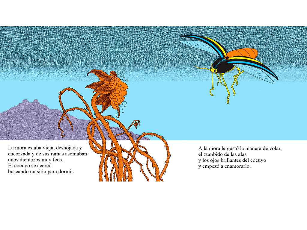 En un largo viaje, el Cocuyo conoce a la vieja Mora, quien le pide que se case con ella. Pero el Cocuyo no quiere enamorarse de una Mora tan vieja y deshojada. Pasado el tiempo, se reencuentran: la Mora es ahora hermosa y el Cocuyo se arrepiente de su decisión. Este cuento pemón sobre el amor no correspondido explica el origen de la luz de los cocuyos.