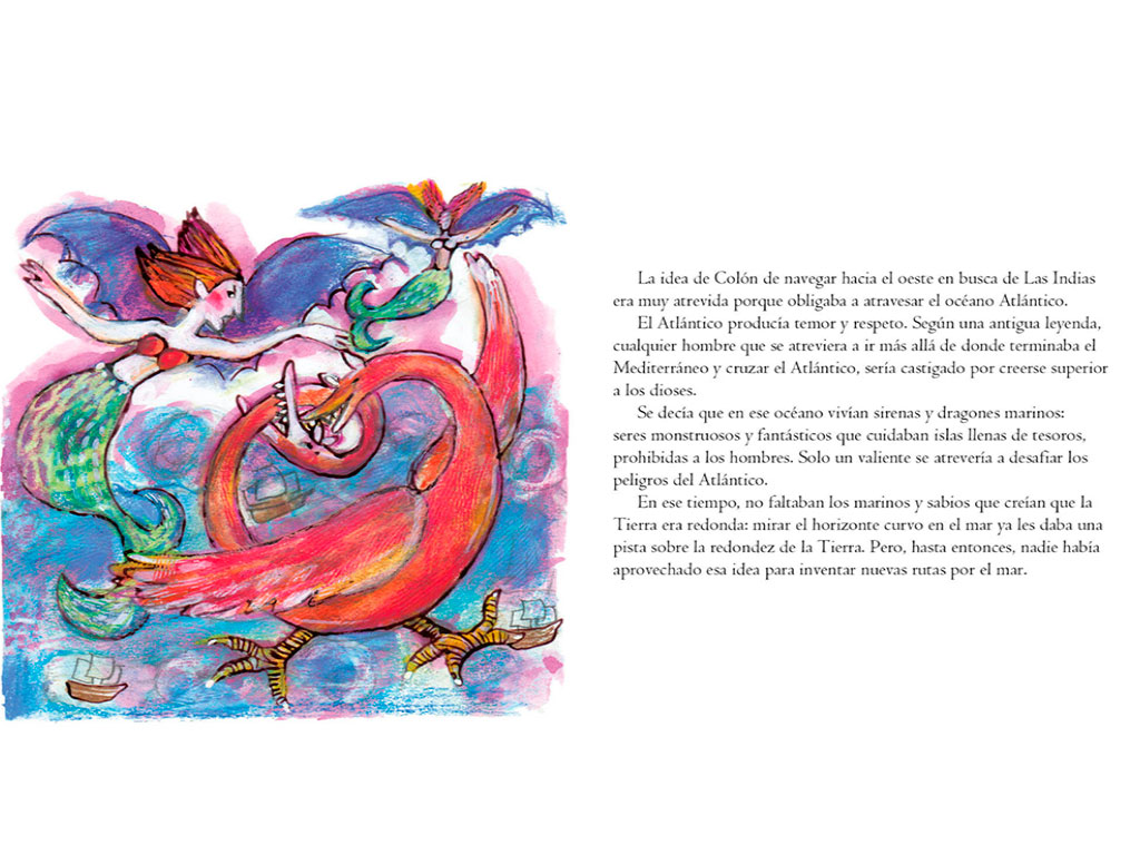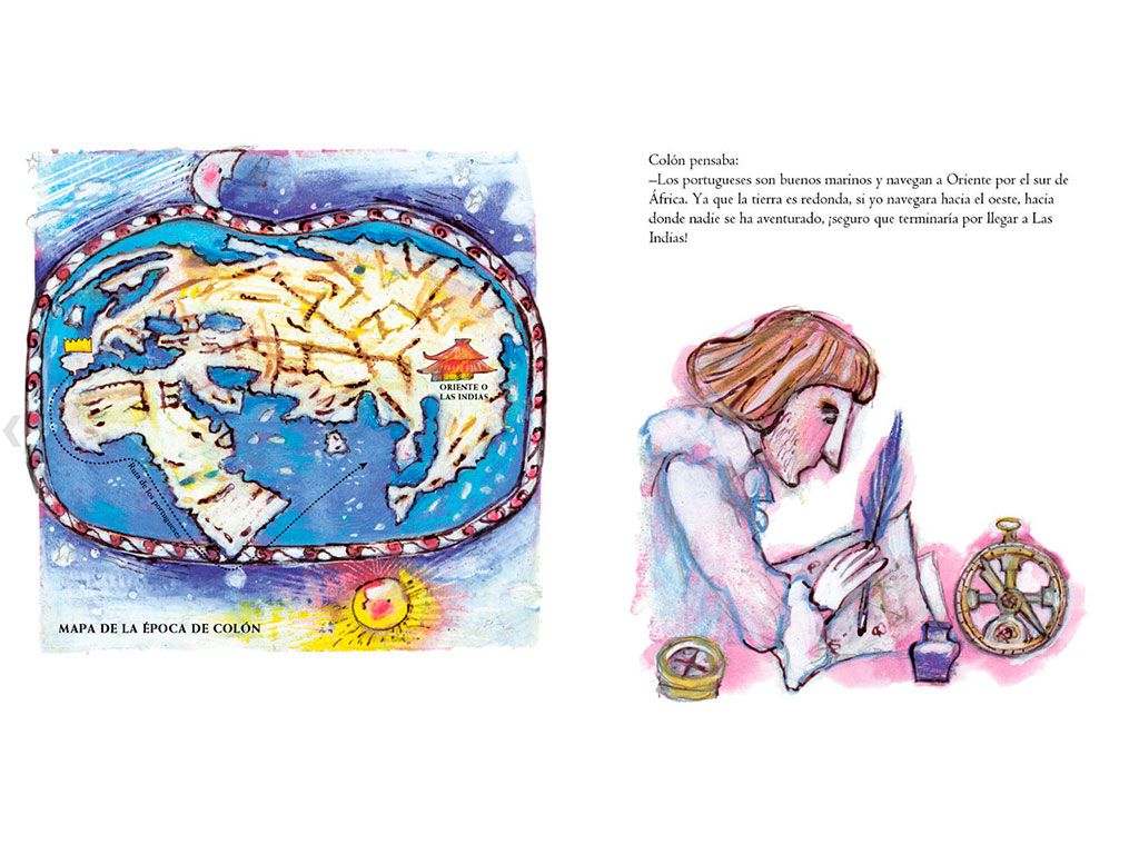 Cristóbal Colón era un navegante deseoso de gloria y aventura. Pensando y mirando sus mapas se convenció de que podía llegar a las ricas tierras de oriente navegando desde España hacia el oeste, para llevar de vuelta oro, especias y piedras preciosas.