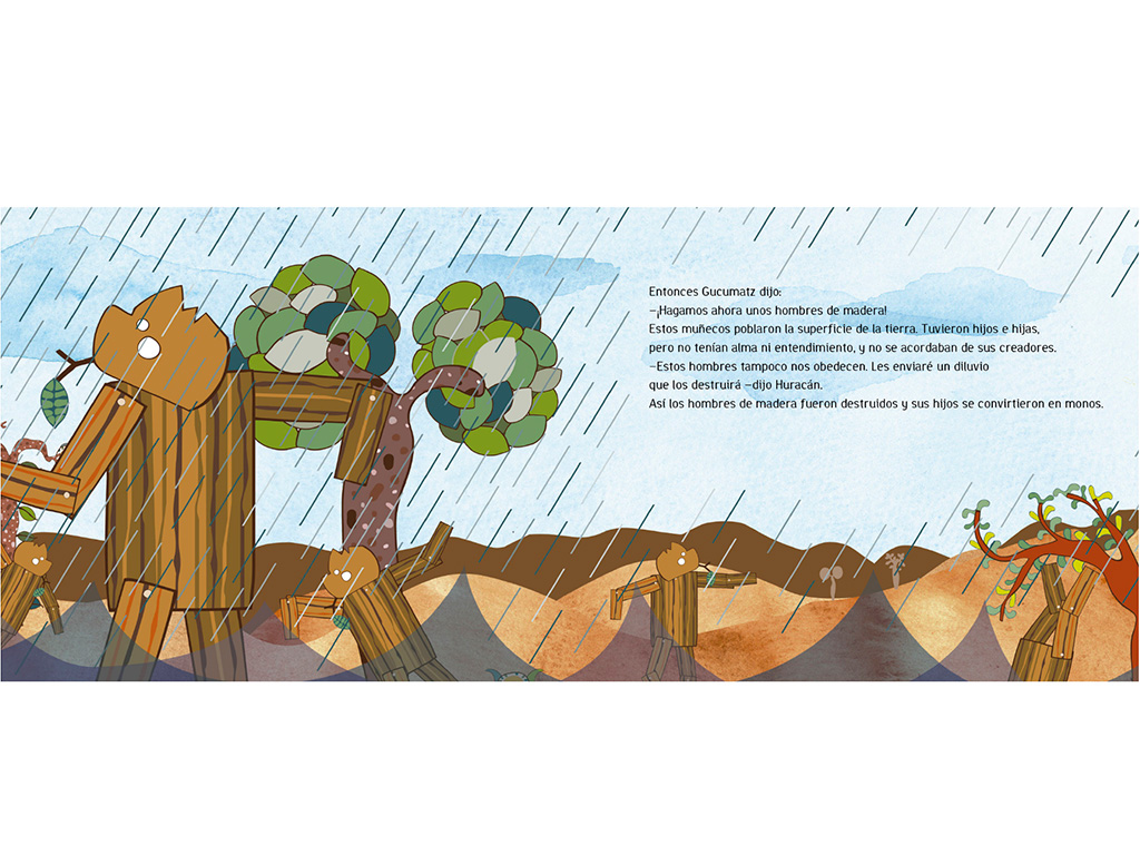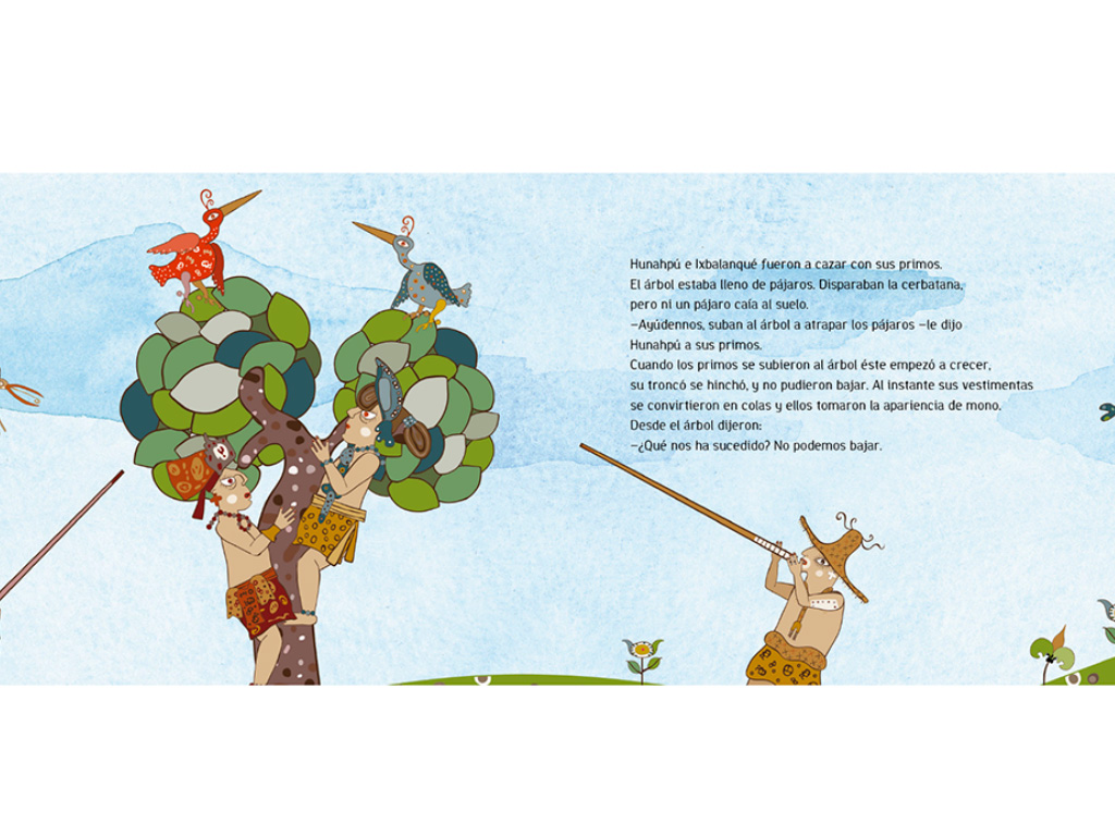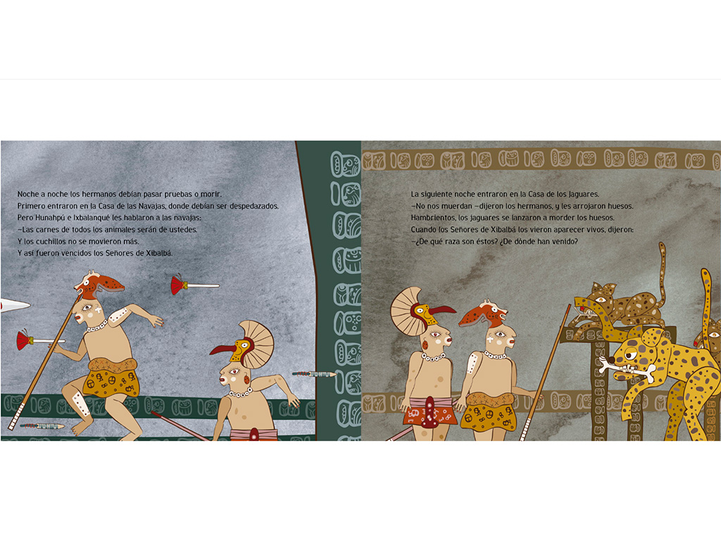 Este libro narra la creación del mundo y de los hombres, y la historia de dos semidioses Hunahpú e Ixbalanqué que se enfrentan con los dioses del inframundo en un juego de pelota. Las ilustraciones están inspiradas en imágenes precolombinas de la cultura Maya.