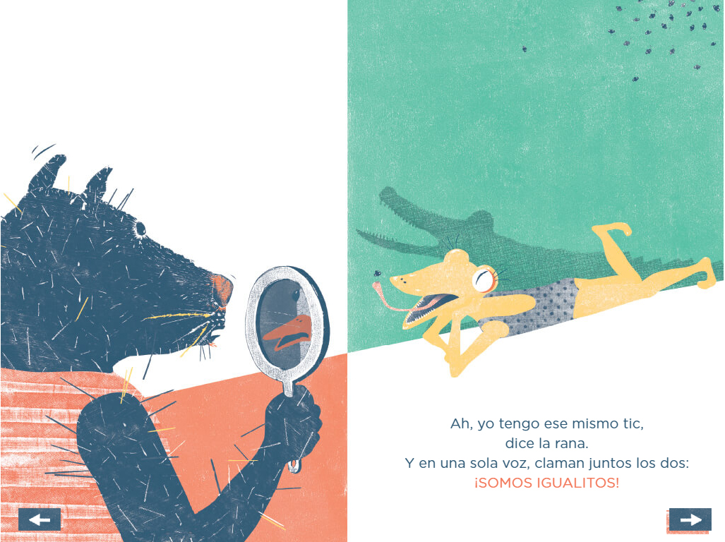 La rana Liza y el perroespín Serafín tienen una cosa en común: algo les pica y no los deja en paz. Después de darse cuenta de que en eso son igualitos, deciden enfrentar esa realidad que los incomoda. Una historia sobre el alivio de mirarse a sí mismo y reconocerse en la propia piel.