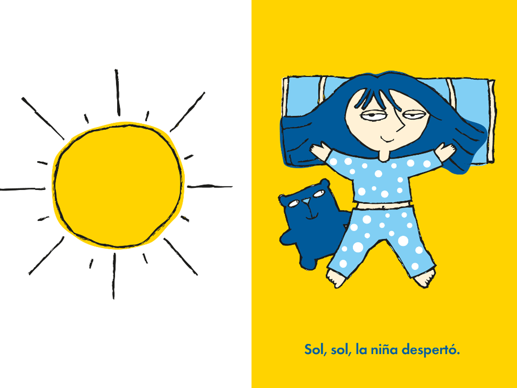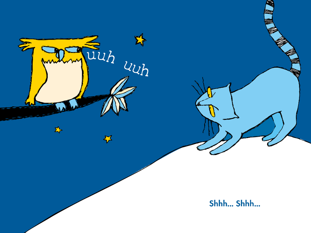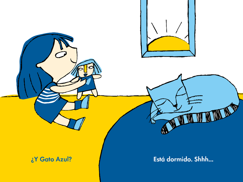 Gato azul cuida en la noche, el sueño de su amiga, para que el sonido del saltamontes, de la rana, del búho y del gallo, no la desvelen. Es en la mañana cuando la niña despierta y Gato azul puede dormir plácidamente.