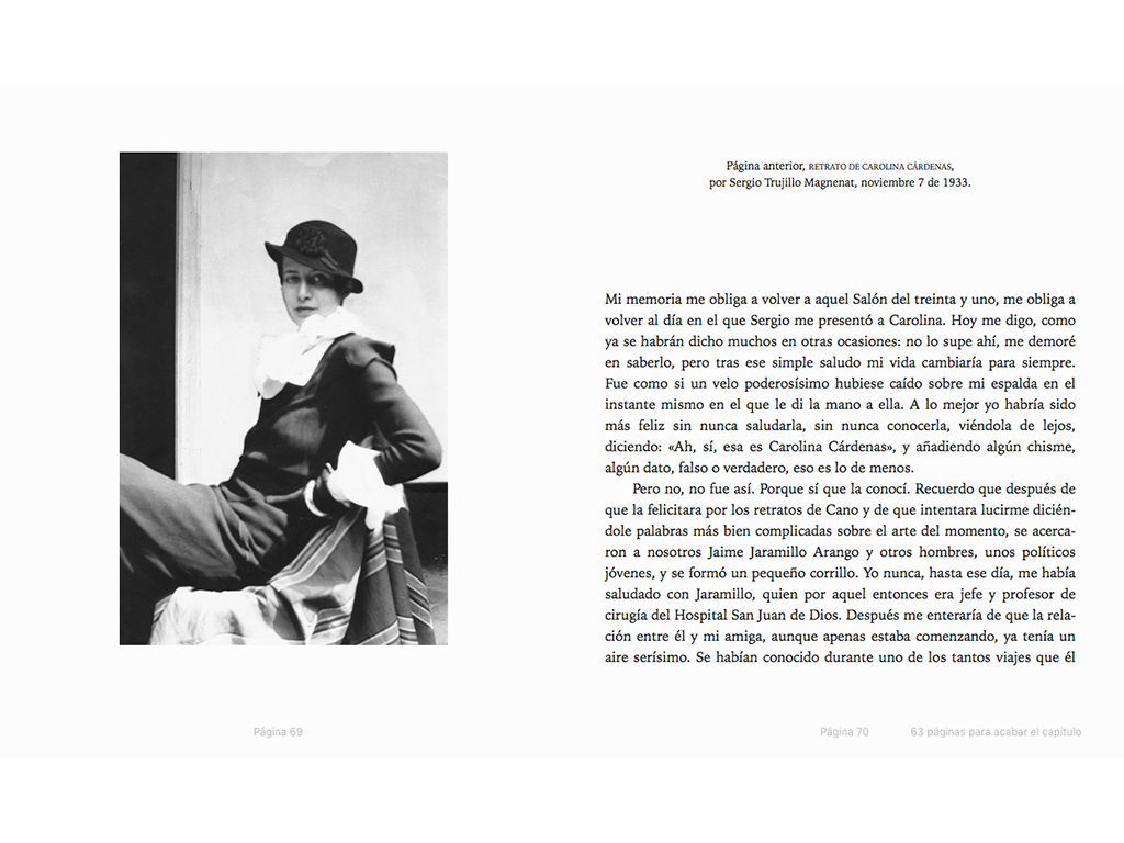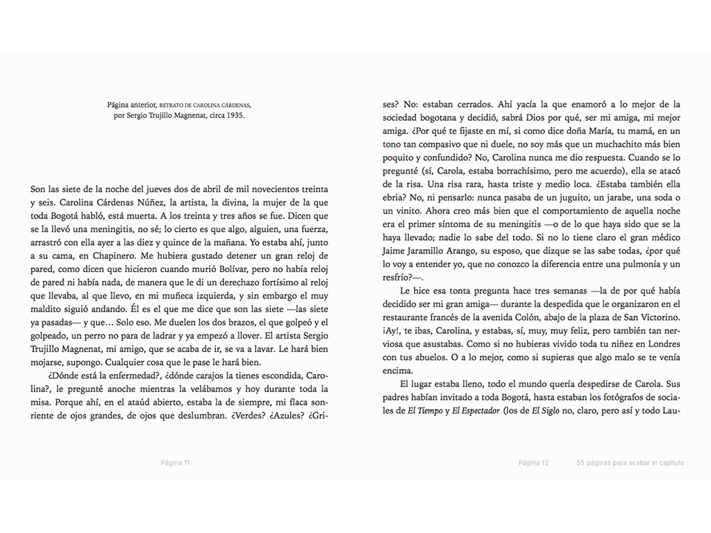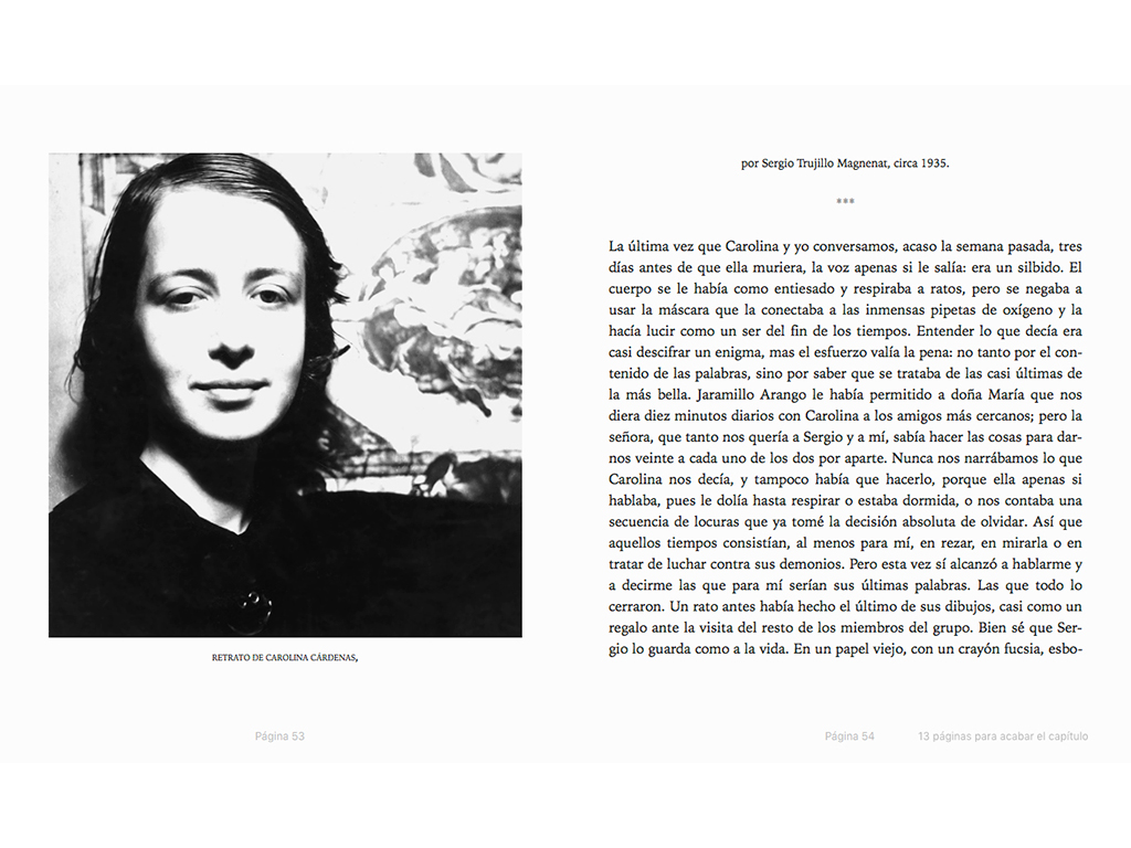 La agonía de quererla no terminó con su muerte. Carolina Cárdenas (1903-1936) fue la mujer más bella, misteriosa y talentosa de la Bogotá de los años treinta. Su nombre es clave en la historia del arte de nuestro país, y sin embargo muchos parecen haberla olvidado. Juan Fernando, un periodista de Ambalema, Tolima, que se enamoró de ella y de las promesas de libertad y modernidad que representaba, es el narrador de esta historia.