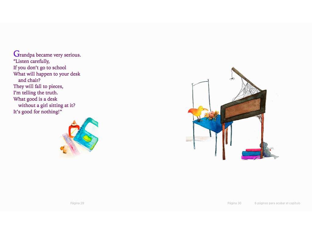 Laurita no se puede dormir, pues no quiere ir al colegio. Su abuelo trata de convencerla de que no tiene nada que temer.