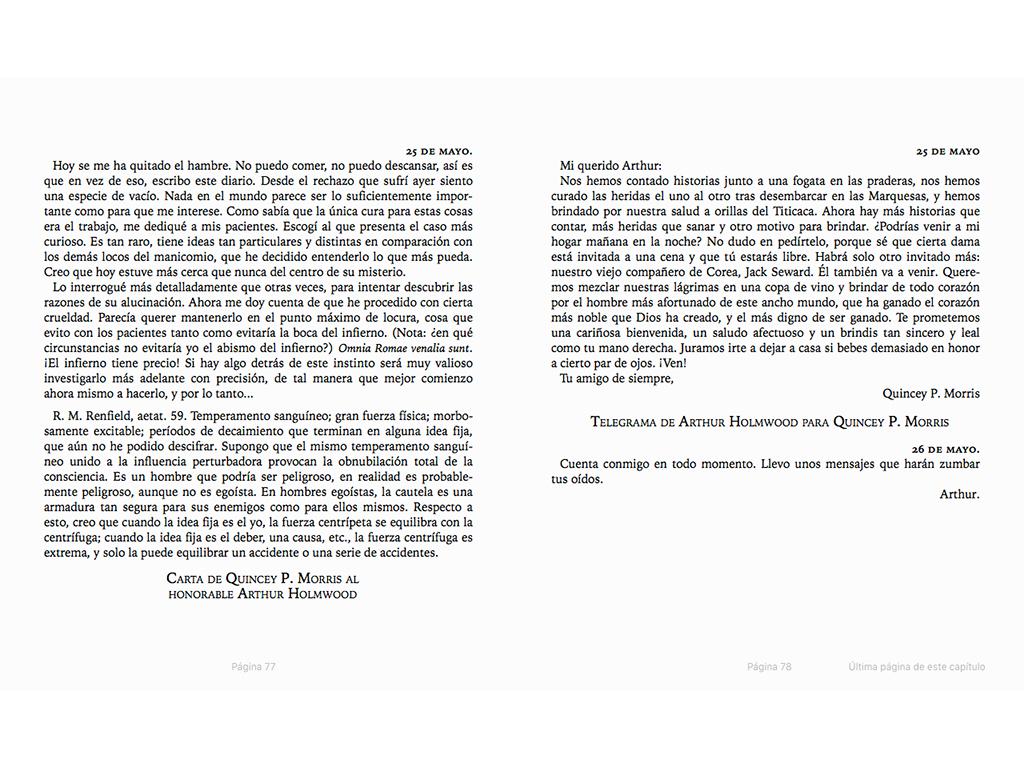 Drácula narra la historia de un grupo formado por tres jóvenes, dos muchachas inglesas y el sabio holandés Van Helsing, en cuyas vidas comienza a entrometerse pavorosamente el conde Drácula, un milenario vampiro. La lucha de los miembros del grupo para impedir que Drácula logre sus malignos fines y los transforme, a ellos y a otros, en seres como él pasa por todas las etapas del horror. En los diarios de los personajes y en las cartas que intercambian entre ellos, elementos que construyen la novela, se mezclan el espanto, el amor y la sangre.