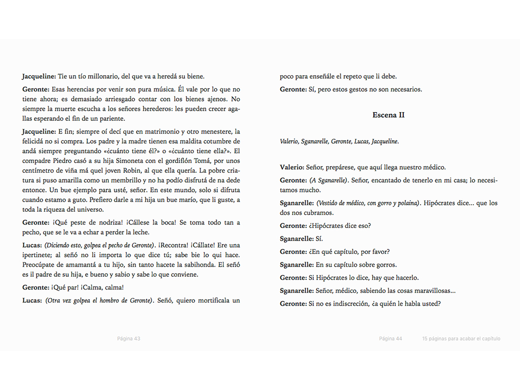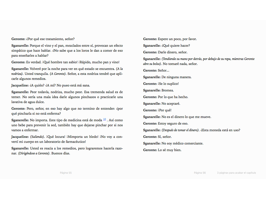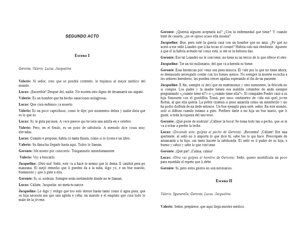 En El médico a palos, un leñador llamado Sganarelle, se convierte en falso médico por acción de su mujer; en El enfermo imaginario, Argán, un burgués hipocondríaco, pide que se le inflijan todo tipo de prácticas para curar su enfermedad imaginaria.