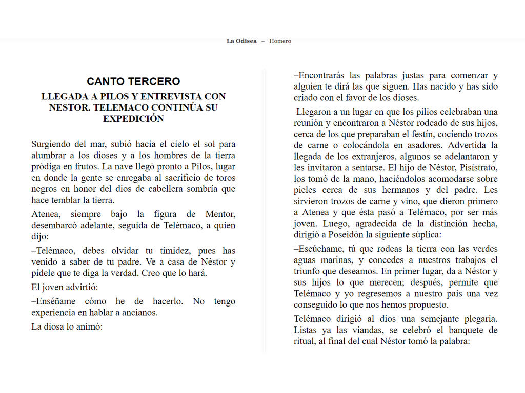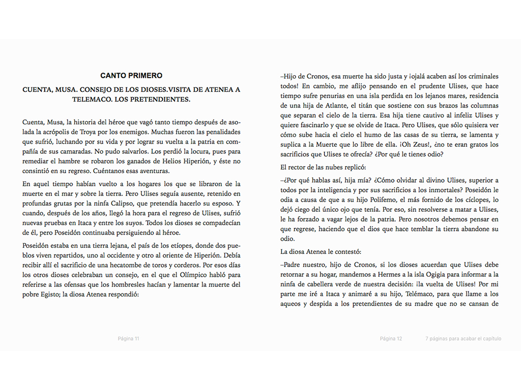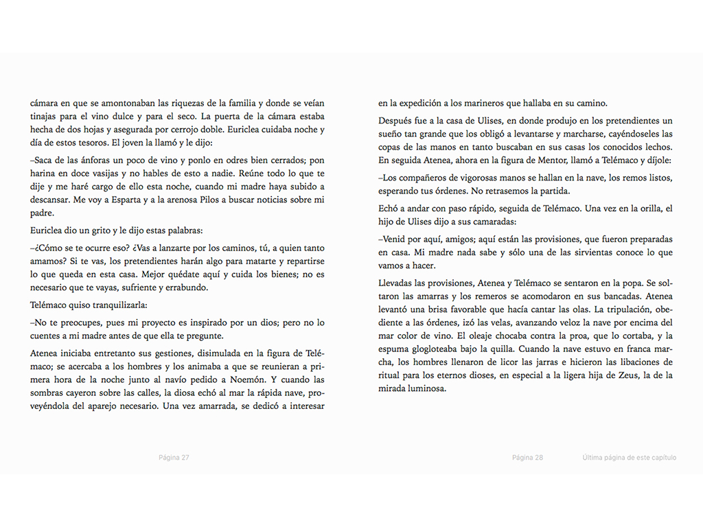 Después de la Guerra de Troya, Ulises viaja de regreso a Itaca, lugar del que era rey y donde lo espera su amada esposa, Penélope. En la Odisea se narran sus múltiples aventuras y las adversidades que como héroe debe superar en su camino a casa. Versión de Manuel Rojas.