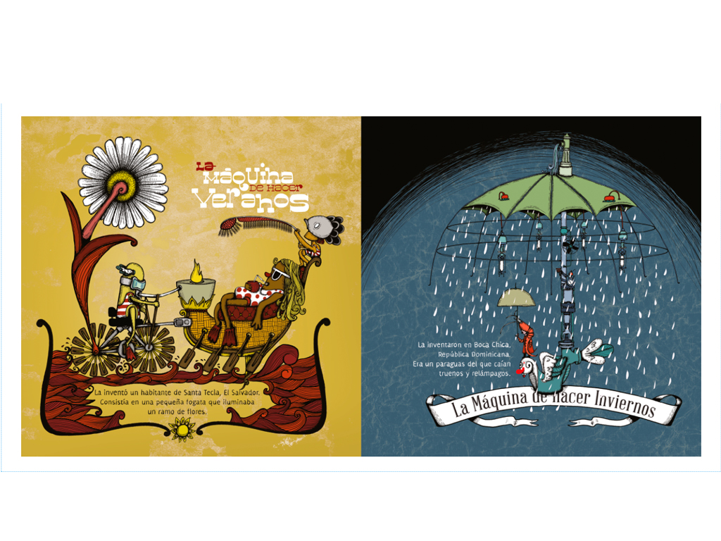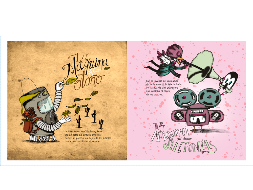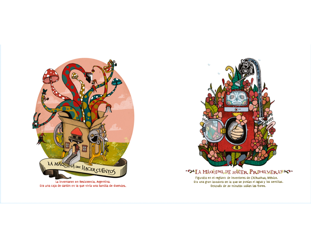 Con Geografía de máquinas nos preguntamos por el funcionamiento de las cosas: los arcoíris, los recuerdos, las palabras dulces, la puesta de sol… Recorriendo la sociedad de inventores, por varios pueblos de América, se descubren estas ingeniosas y bellas máquinas, pero quiénes fueron los creadores o si se llegaron a construir, son misterios que siguen abiertos para explorar en la imaginación