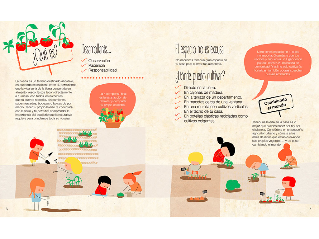 Este libro es para toda la familia, profesores y alumnos, y para todas las edades. Solo hay que entusiasmarse, seguir las simples instrucciones y podrás tener tu propia huerta. La huerta es un sistema en que todo se relaciona entre sí y permite que la vida surja de la tierra convertida en alimento fresco que llega directamente a tu mesa con todos los nutrientes que tu cuerpo necesita. Tener una huerta en casa es lo mejor que puedes hacer por ti y por el planeta. Conviértete en un pequeño agricultor urbano y súmate a los miles de niños que están cultivando sus propios vegetales… y de paso, cambiando el Mundo.