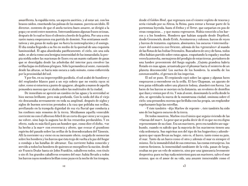 Joseph Conrad se basó en su propia experiencia traumática como navegante por el Congo Belga para escribir esta oscura alegoría de la condición humana. Charles Marlow relata el viaje que realizó como empleado de un vapor, remontando el río Congo en busca del misterioso señor Kurtz, un hombre blanco que había logrado dominar los insondables secretos de la selva africana, creando tras de sí una leyenda. El poder simbólico y psicológico de la novela desnuda la perversidad que acecha tras la ilusión de progreso y civilización, pues además de la barbarie, el oprobio y los terribles efectos depredadores del colonialismo, muestra la inconsistencia del pensamiento que pretende justificarlo.