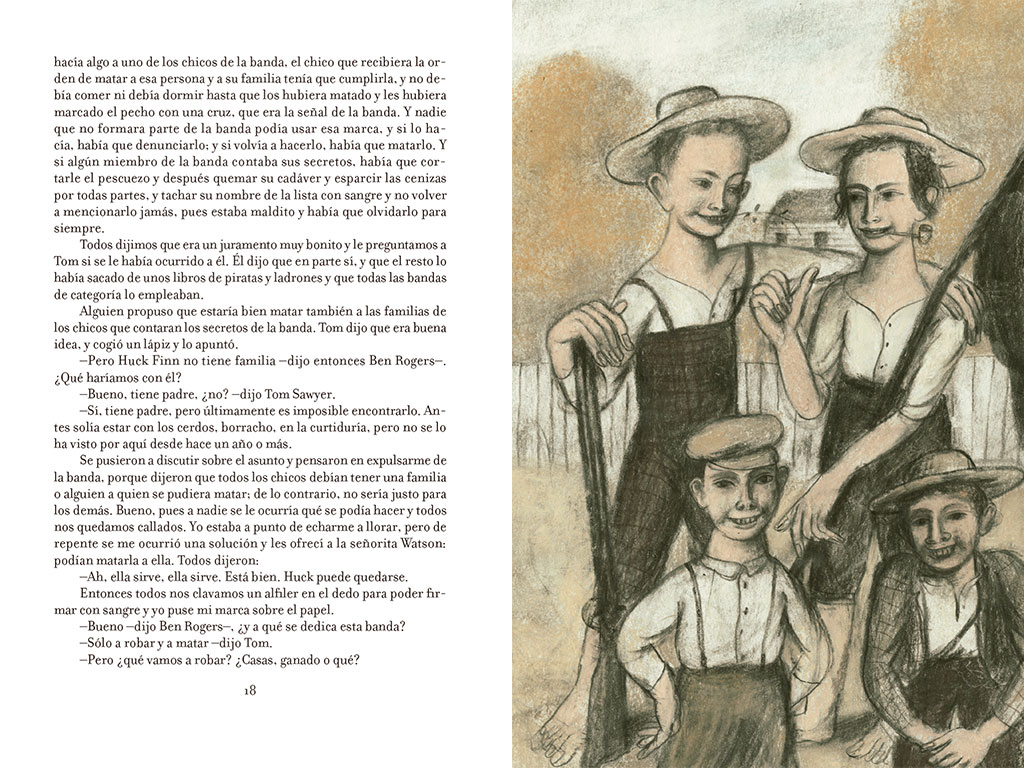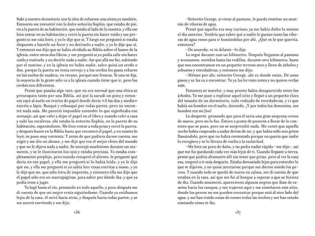 Las aventuras de Huckleberry Finn, considerada una de las primeras grandes novelas estadounidenses, presenta una visión más oscura y desencantada que Las aventuras de Tom Sawyer. La trama está llena a rebosar de picaresca y de ese sentido del humor que tan bien dominaba Mark Twain. Así, Huckleberry, pese a los intentos de la viuda Douglas por «civilizarlo», sigue siendo ese canalla entrañable y asilvestrado. Obligado a escapar de las palizas de su padre, el camino de Huck se cruzará con el de Jim, un esclavo negro que se ha fugado al enterarse de que quieren venderlo. En ese camino de huida, ambos entablarán una sincera amistad, llena de lealtad y admiración mutua.