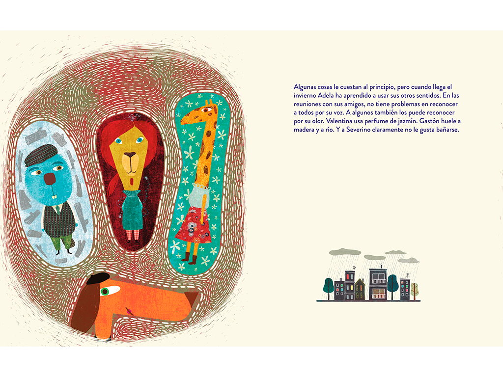 Adela no encuentra sus calcetines en su closet. Adela no reconoce a sus vecinos. Muchas cosas comienzan a desaparecer a su alrededor. Pero no es que las cosas no estén. Es ella la que no las puede ver. Poco a poco se acostumbra a no ver y comienza a usar sus otros sentidos. Adela y los calcetines desaparecidos es un libro autobiográfico sobre la discapacidad visual.