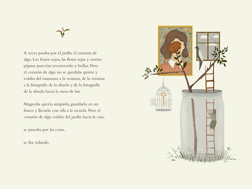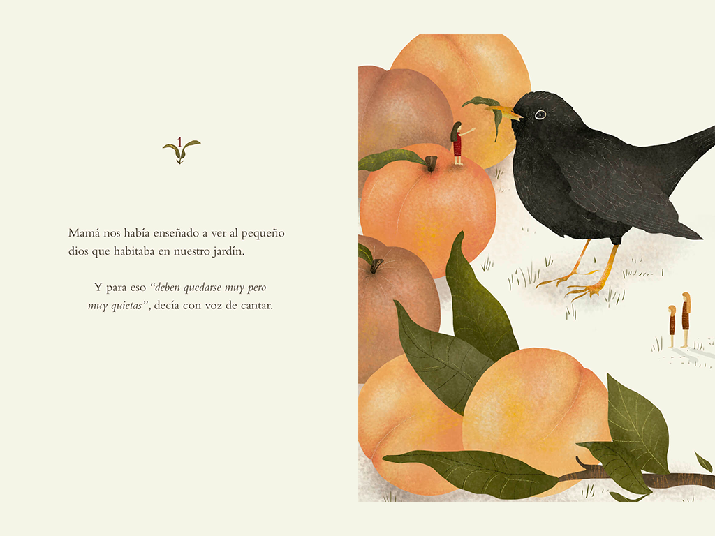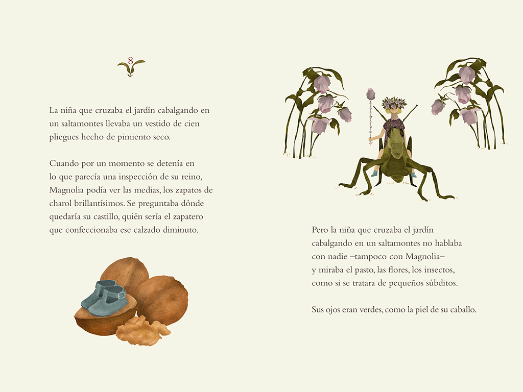 Este libro es un puente entre la vigilia y el sueño, entre la realidad y la fantasía. Las escenas ocurren en un jardín visible a través de la ventana o existente solo en los sueños. Quien guía la aventura es la madre, que presenta los personajes que habitan ese mundo: niños que se convierten en peces y desaparecen en el fondo de los ríos, niñas-flores que cabalgan saltamontes sobre las crestas de las hojas. Al final del día son historias que se convierten en abrazos, en compañía.