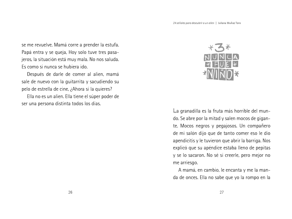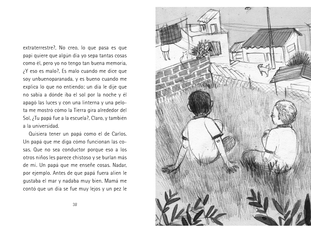 Benjamín mira con desconfianza a su papá. Está convencido de que lo posee un alien. Su misión es descubrir las circunstancias en las que fue secuestrado por esa fuerza extraterrestre y tratar de reparar el daño. No descansará hasta descubrirlo. Sin embargo, el hallazgo de la verdad no es lo que esperaba. Con el pasar de las páginas, sale a la luz el misterio, un dolor que está más allá del entendimiento de Benjamín. Esta novela fue la propuesta ganadora del 3er concurso de escritura Tragaluz, 2016.