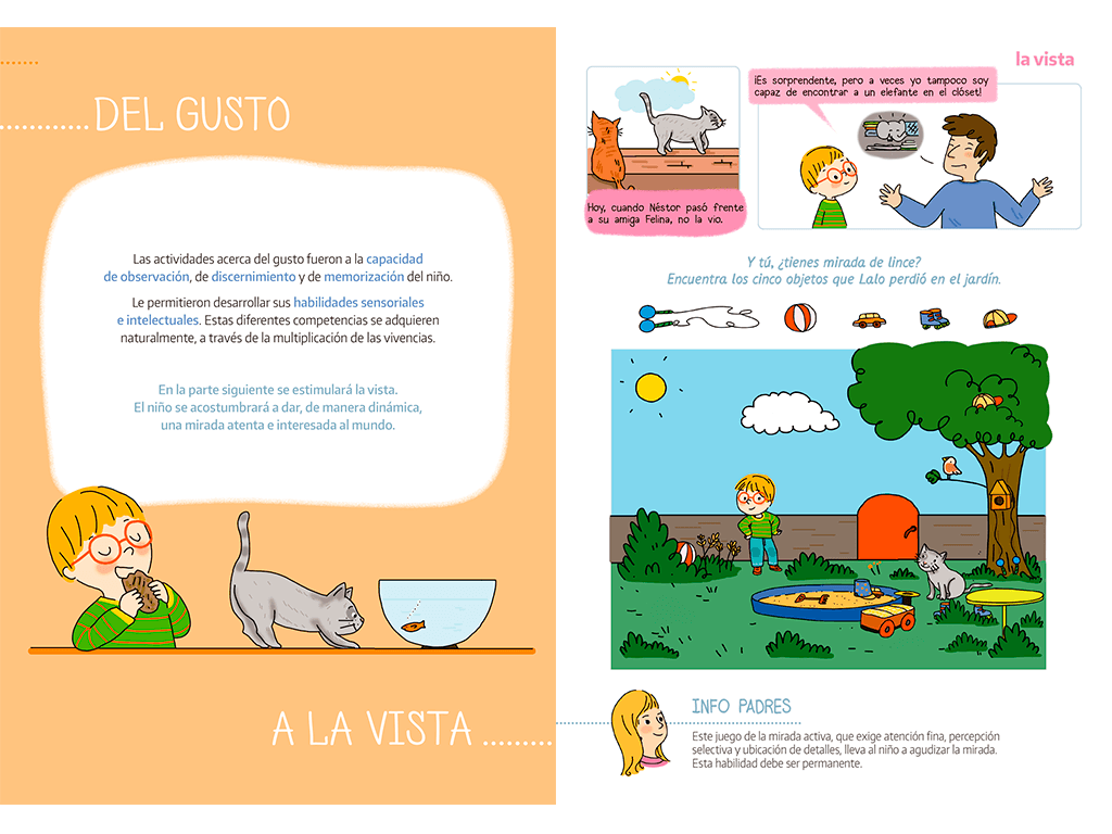 Una historia, un método explicado paso a paso y 20 actividades para lograr que su hijo viva más concentrado. Jugando con la imaginación, el cuestionamiento y las sensaciones, el niño agudiza su mente y aprende a vivir con conciencia plena. Sencillas explicaciones enmarcan cada actividad y orientan a los padres a lo largo de toda la obra. Un libro ideal para el desarrollo psicomotor de los pequeños.