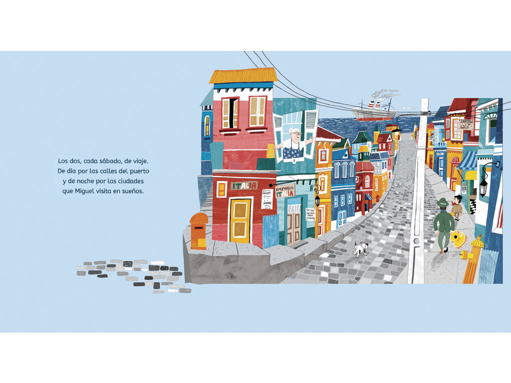 Entre los coloridos cerros de Valparaíso transcurre la historia de Miguel, que cada sábado recorre el puerto junto a su padre. Una dupla de guitarra y pandero cuya complicidad no termina al finalizar el día y acompaña al pequeño hasta en sus sueños. Un álbum de la premiada autora María José Ferrada, con ilustraciones de Marcelo Escobar que rescatan el tradicional espíritu porteño.