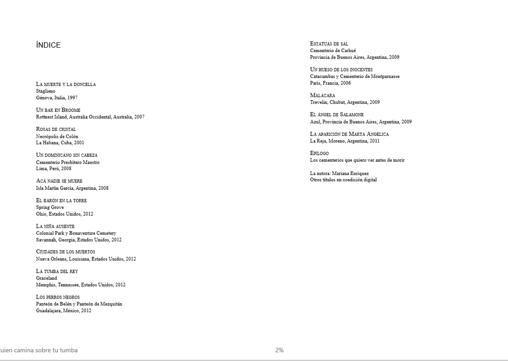 Mariana Enriquez es catadora de cementerios; los busca en los lugares a donde viaja y planea viajes para encontrarlos. Desde su mirada particular, que enriquece con una investigación implacable, baraja los nombres, fechas y epitafios grabados en las tumbas para desentrañar las motivaciones y ansiedades de quienes las pusieron ahí.
