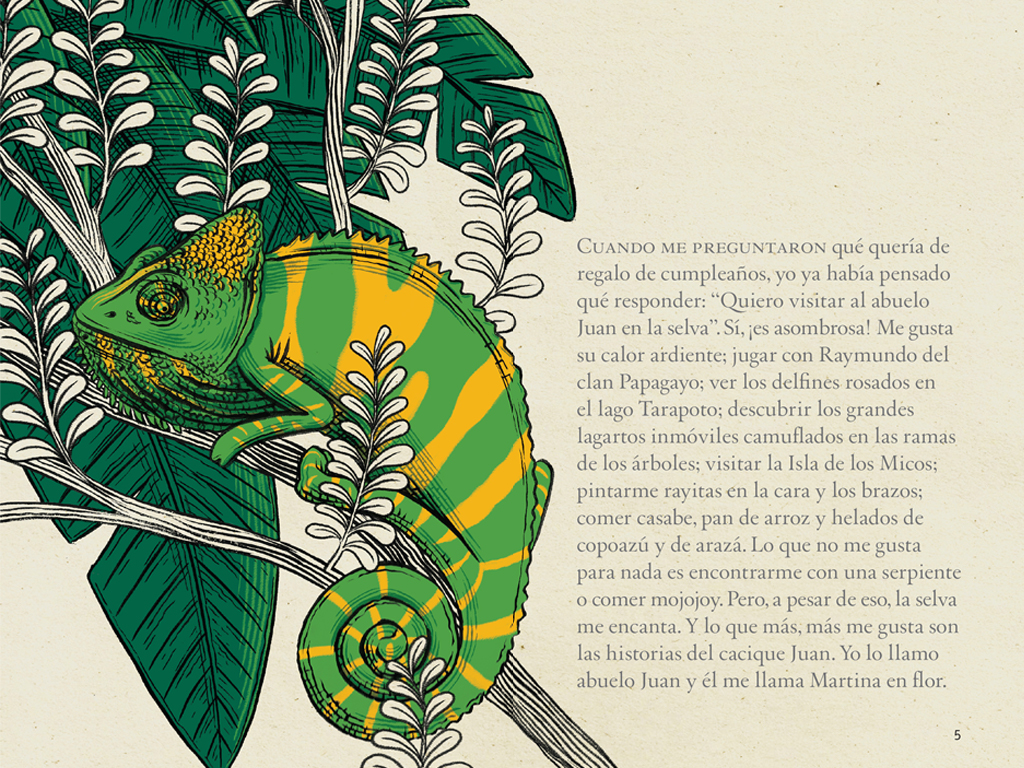 Para Martina visitar al abuelo es viajar hasta las afueras de Leticia, ver brasas en la hoguera, vibrar con los sonidos y, sobre todo, escuchar historias. En este viaje, el abuelo Juan le cuenta la historia de Moniya Amena o el Árbol de la vida… y entiende que todo en la tierra tiene una íntima conexión