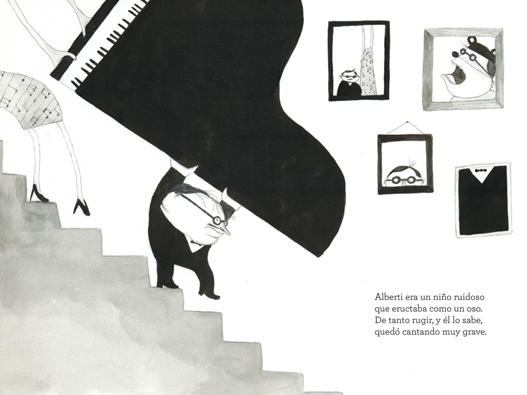 Alberti era un niño ruidoso que eructaba como un oso. De tanto rugir, y él lo sabe, quedó cantando muy grave. ¿Cómo sera este inquietante personaje? Descúbrelo en este hermoso libro donde música, letra e ilustración se unen para contarnos un melodiosa historia.