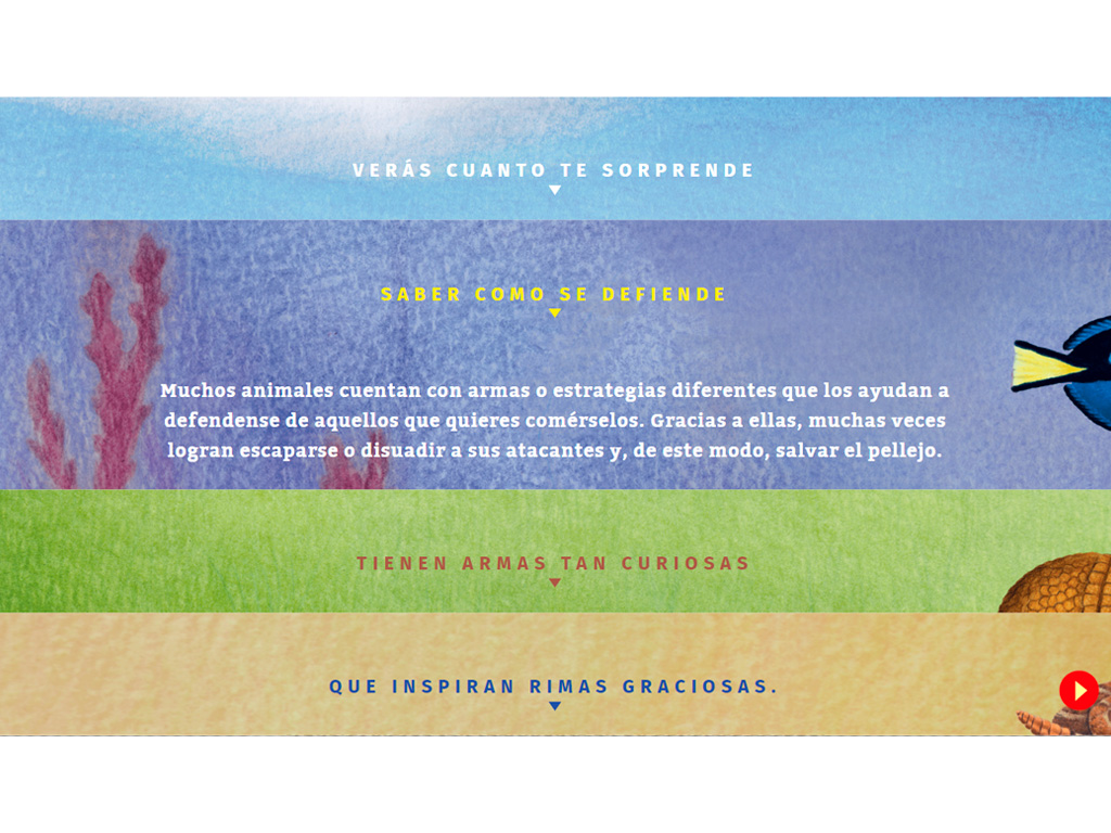 ¿Cómo se las ingenian algunos animales para defenderse de sus depredadores y no transformarse en un delicioso bocado? Tres creadoras se unen para responder esta pregunta y cada una lo hace a su modo: con una rima, con un texto informativo, con una ilustración. Un exquisito cruce entre lenguaje, información e imagen, para que los más pequeños aprendan.