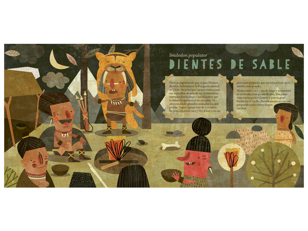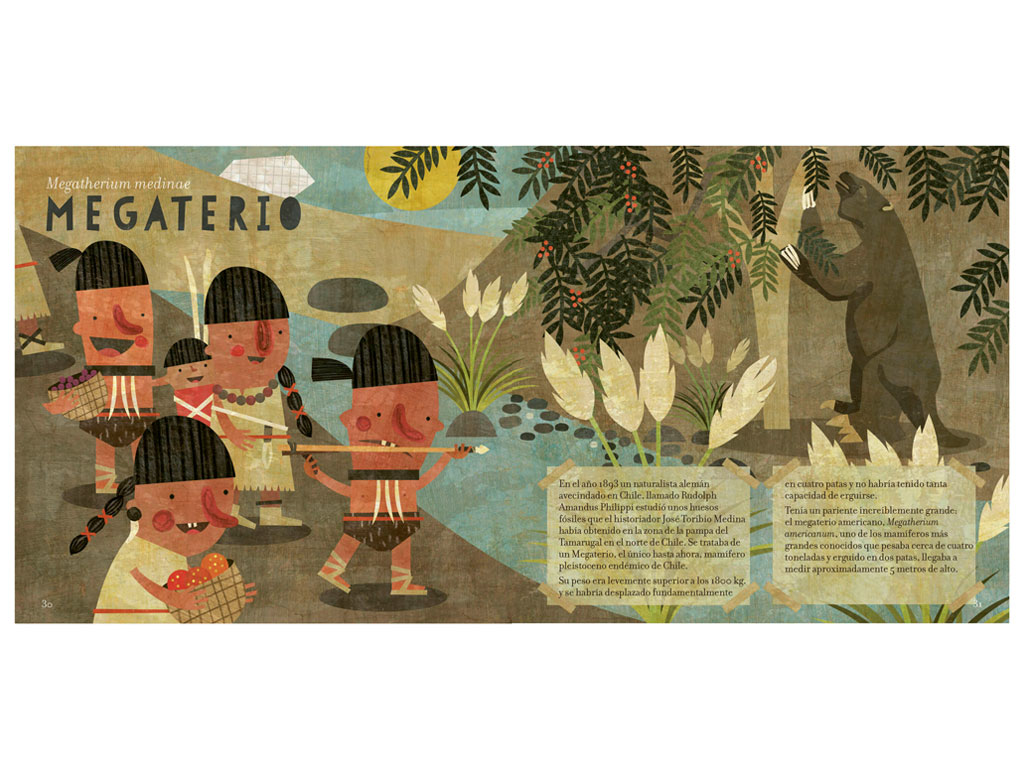 Este libro ilustrado para niños nos muestra quince mamíferos prehistóricos de la época del pleistoceno que habitaron Chile. En sus ilustraciones podemos ver el paisaje, vestimentas y herramientas que usaban en la época y las características de estos animales que convivieron con personas en la prehistoria de nuestro país.