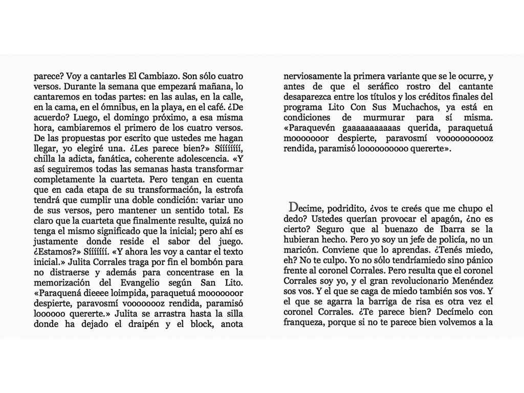 El Cambiazo es una canción que canta el ídolo juvenil Lito Suárez, y que va cambiando una estrofa semanalmente de acuerdo a las sugerencias enviadas por sus fanáticos. A su vez, el coronel Corrales, padre de Julia, está encargado de mantener el orden frente a las subversiones de un país en dictadura. Así, este cuento es un relato coral que se va intercalando en cada párrafo, distintas voces. Experimentando así con un prosa muy natural, que suena tal cual se habla, para dar mayor énfasis a los atroces hechos violencia que se asoman y que sorpresivamente, irrumpen junto con los últimos versos de la canción inventada por todos.