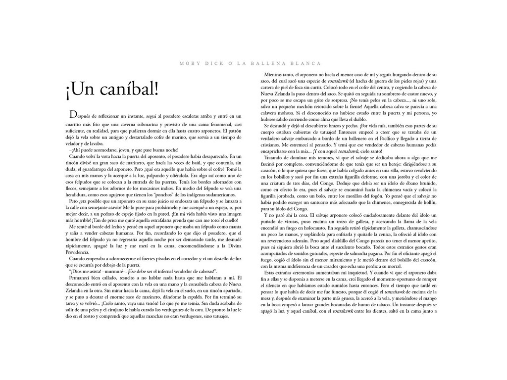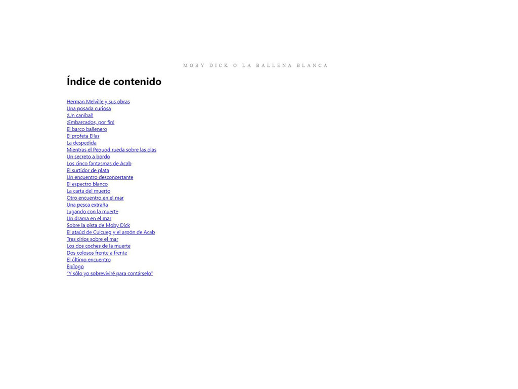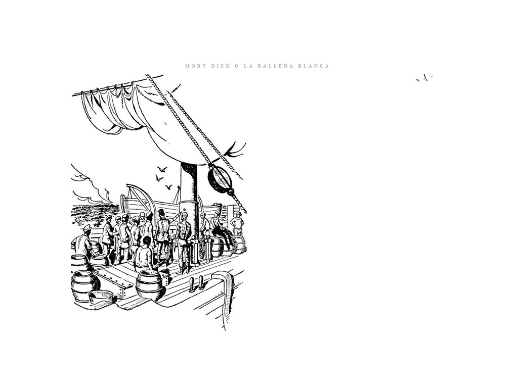 Novela que relata el conflicto entre el capitán Ahab, jefe del ballenero Pequod, y la gigante ballena blanca Moby Dick –que en realidad es un cachalote–, la cual ya le ha quitado una de sus piernas hasta la altura de la rodilla.