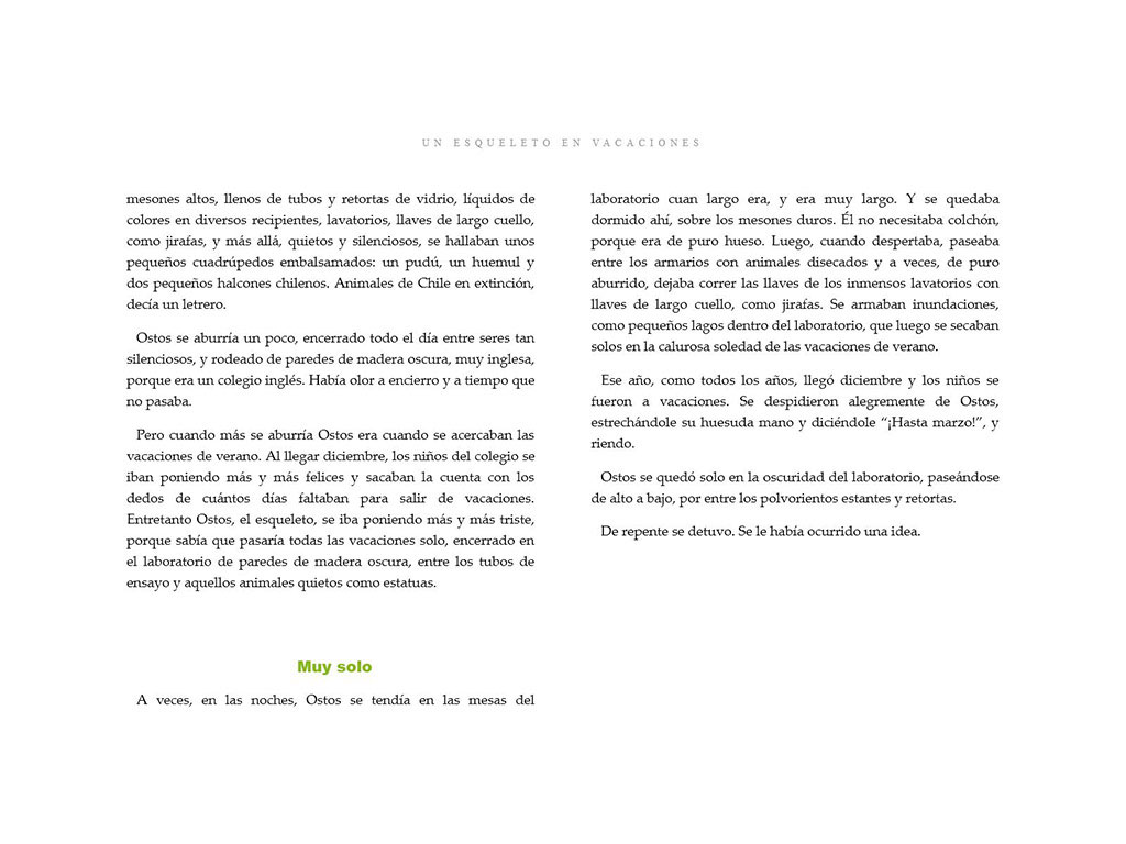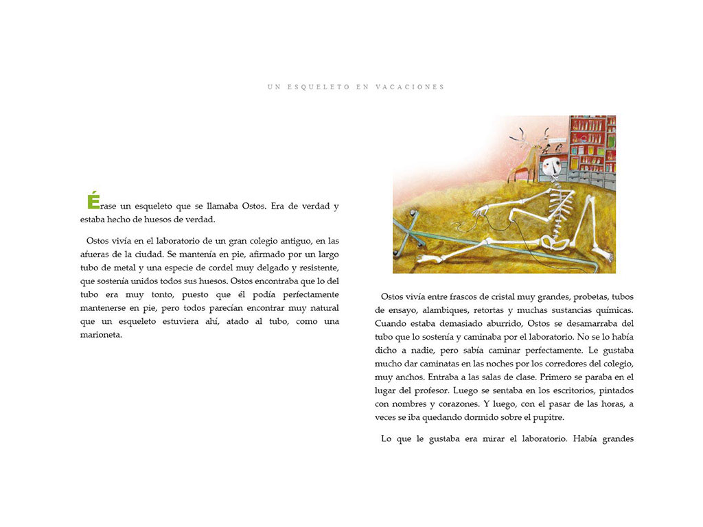 El primer cuento de este libro cuenta las aventuras de Ostos, el esqueleto del laboratorio de un colegio, quien aburrido de quedarse solo en vacaciones, decide salir a pasear. ''Blu'' es el relato de un tierno monstruo azul, quien demostrará la importancia del amor y la amistad.