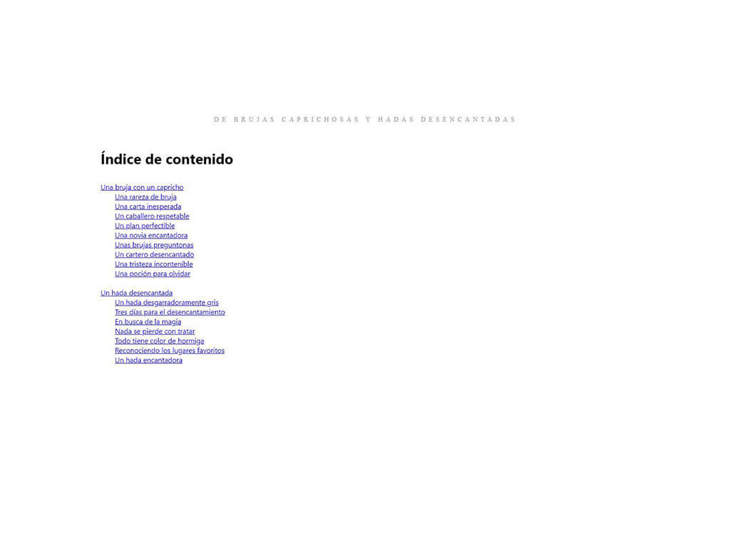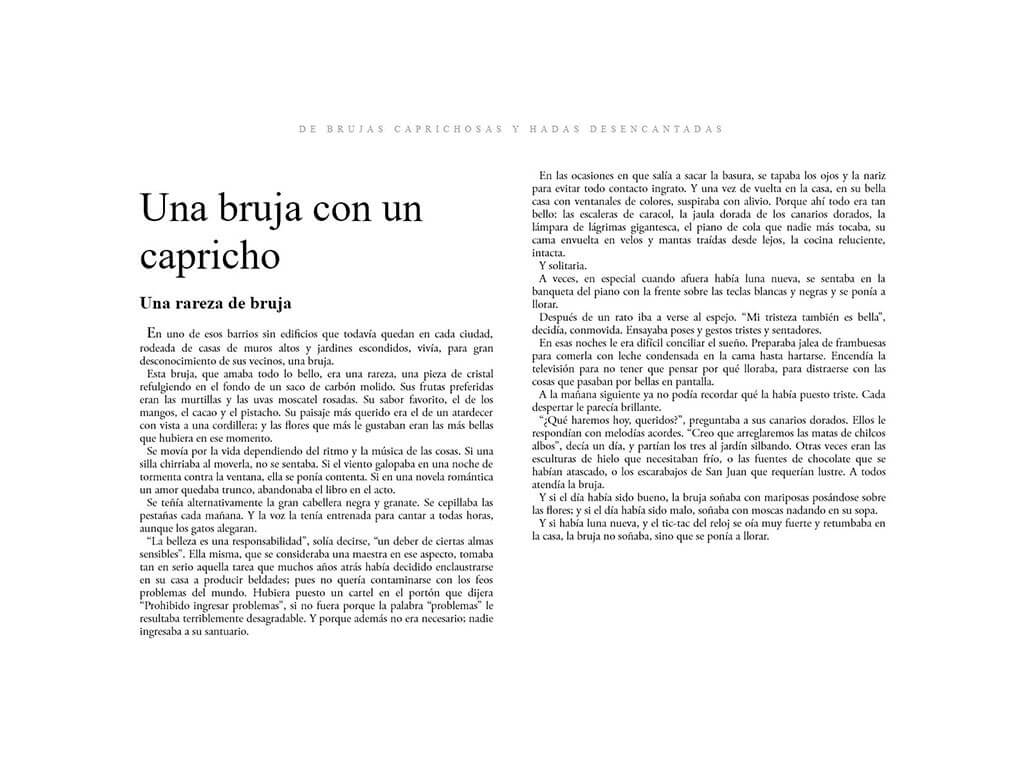 De brujas caprichosas y hadas desencantadas presenta dos historias: la de una bruja caprichosa, a quien su vida cambiará para siempre luego de recibir una inesperada invitación a un matrimonio, y la de un hada, que por no haber usado su magia en un máximo de tiempo, está pronta a desaparecer. Ambos arquetipos están contextualizados en el mundo contemporáneo y representan de manera entretenida y con humor problemas e inquietudes que también atañen a los seres humanos del mundo de hoy.