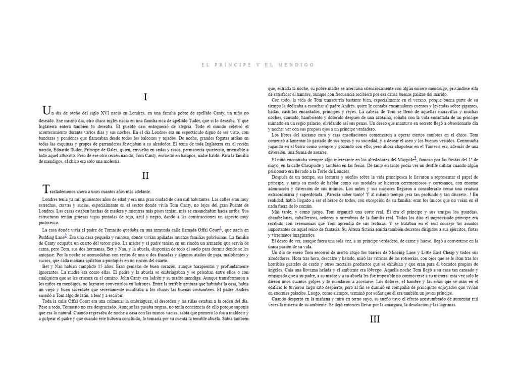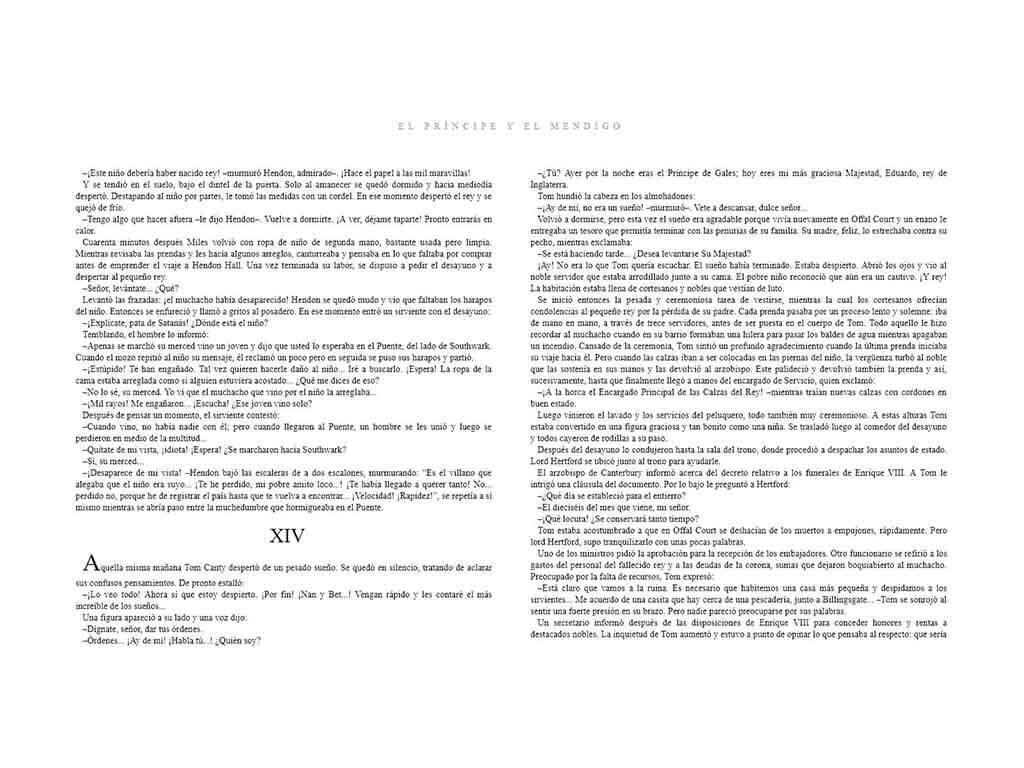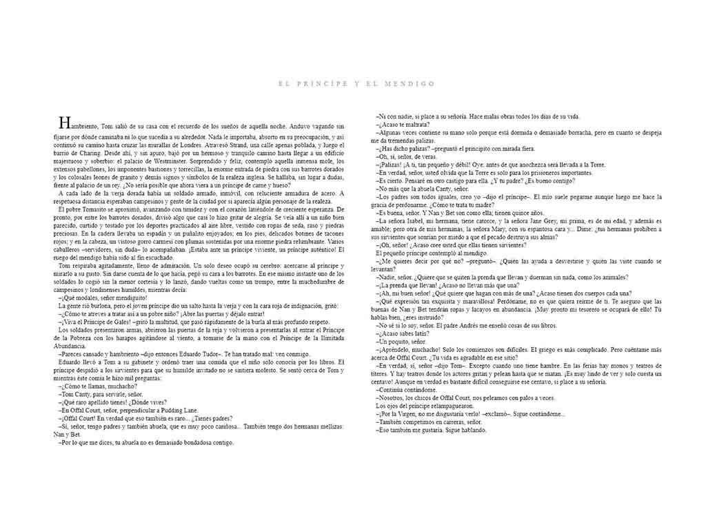 En esta novela, dos niños, un príncipe y un mendigo, intercambian sus papeles, dejando al descubierto las enormes diferencias e injusticias sociales que existían en el reinado de Enrique VIII de Inglaterra. Si la mendicidad era una carga insufrible, no lo era menos pesada la de príncipe, sobre todo cuando se era un niño. Una novela que muestra la importancia de ponerse en el lugar de otro antes de criticar, juzgar o condenar.