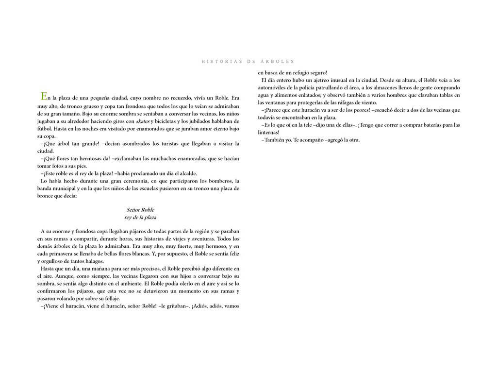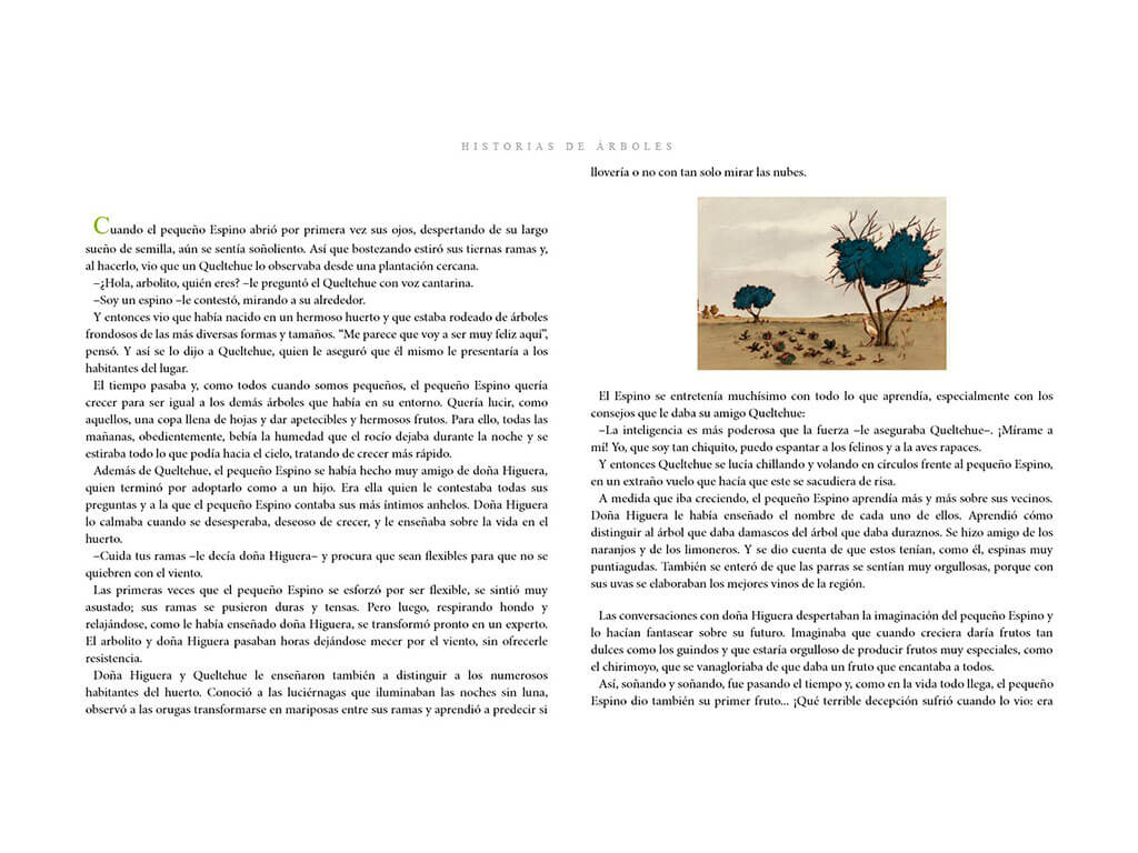 Los tres cuentos que componen este libro están protagonizados por árboles, quienes, cada uno a su manera, entregan importantes enseñanzas de vida. En “El pequeño Espino”, su protagonista desea crecer como los otros árboles, pero deberá descubrir aquello que lo hace único para encontrar su propio aporte. “El Roble y el huracán” enseña la importancia de las raíces para poder crecer, desarrollar las fortalezas y ser cada día mejor. Por último, “El Árbol Recoge Sueños” advierte de los peligros de la vida moderna y recuerda el valor de cuidar la naturaleza.