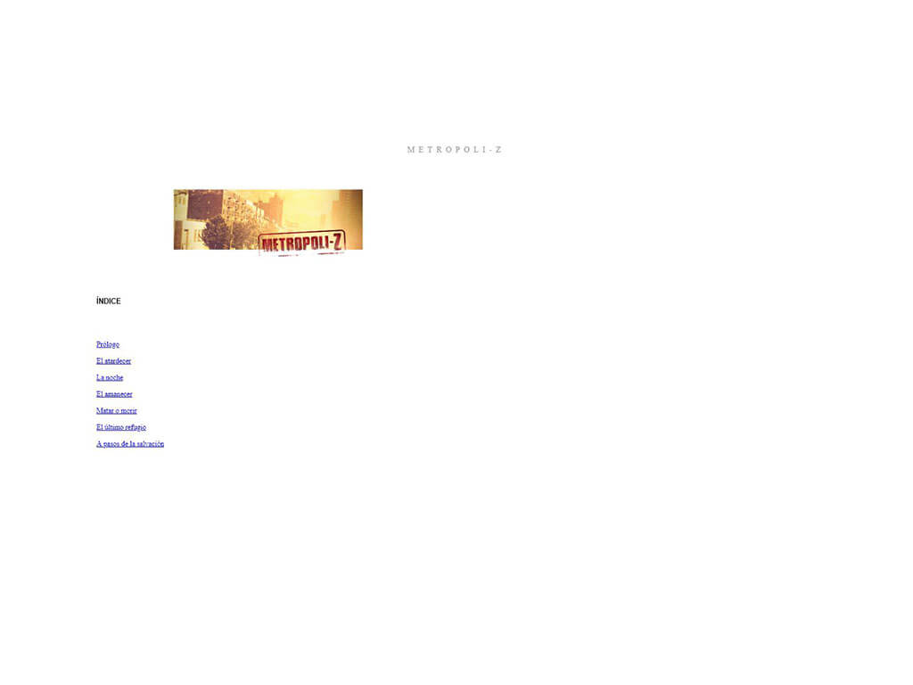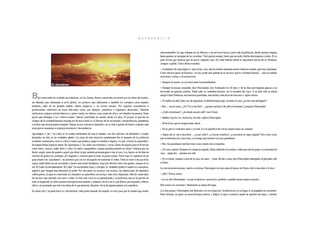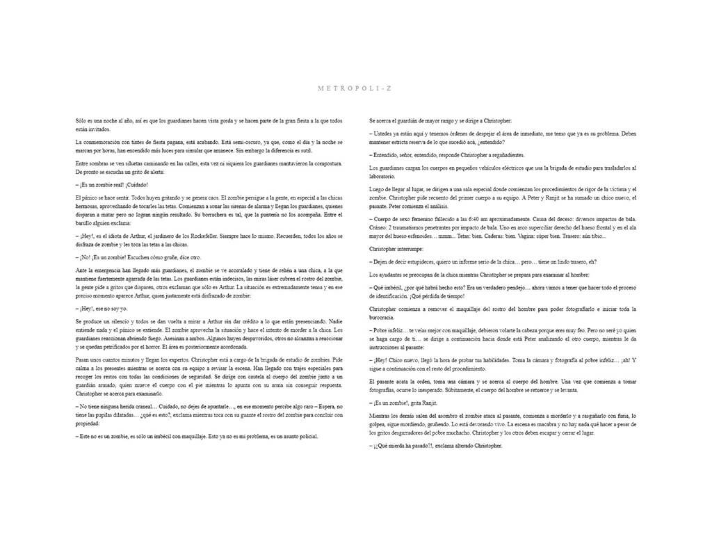 El hedor de la muerte le era delicia, cada imagen macabra avivaba su torcido pensamiento; sangre y tripas, piel desgarrada… Christopher Harris, de 17 años, pequeño genio incomprendido, maquina cómo llevar a cabo su mayor anhelo, un mundo Zombie. Él, por supuesto, sería su líder. Su intelecto superior le permitiría sobrevivir al proceso de transformación y ser más que una bestia. Al menos era lo que él pensaba ¿Podrá Christopher manejar las consecuencias de su propia creación? Metropoli-z, una alucinante historia de zombies, como jamás la hubieses imaginado.
