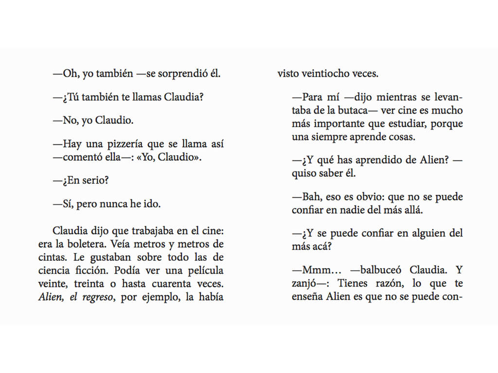 Claudia y Claudio se conocen viendo películas de aliens. Entre boliches de media noche, películas raras y maltas con huevo, secretamente, ambos personajes se enamoran mientras recorren el centro de la ciudad. Pero Claudio intuye que Claudia guarda un triste secreto. La prosa de Alejandra Costamagna está llena de humor y momentos tristes. Llena de silencios también, generando así atmósferas llenas de intimidad entre sus personajes.