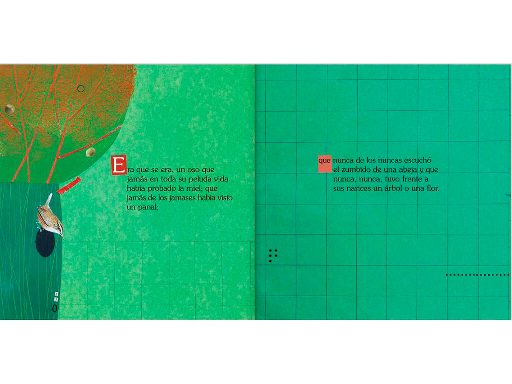 Cierto ilustrador malhumorado (porque no le habían puesto sus cinco terrones de azúcar a su café) dibuja un oso triste. Era un oso que jamás en su peluda vida había probado la miel, jamás había visto un panal y nunca había escuchado el zumbido de una abeja. En un descuido, su hijo Joaquín se encarga de redibujarlo y hacer que el oso luzca mucho más contento.