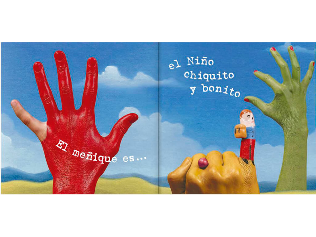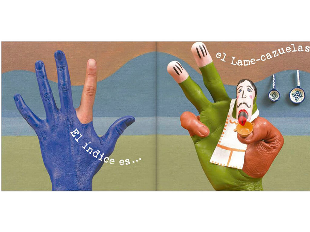 Fotografías de manos caracterizadas como personajes, para que a través de un juego ayuden a los niños pequeños a identificar los nombres de los dedos de la mano.