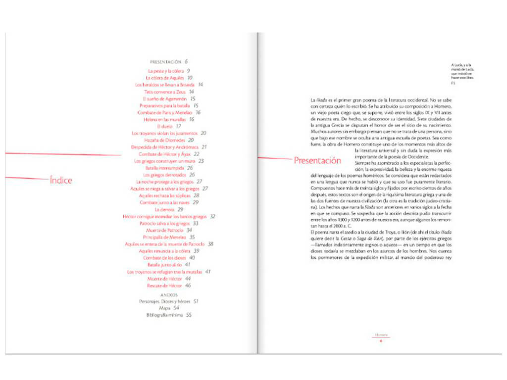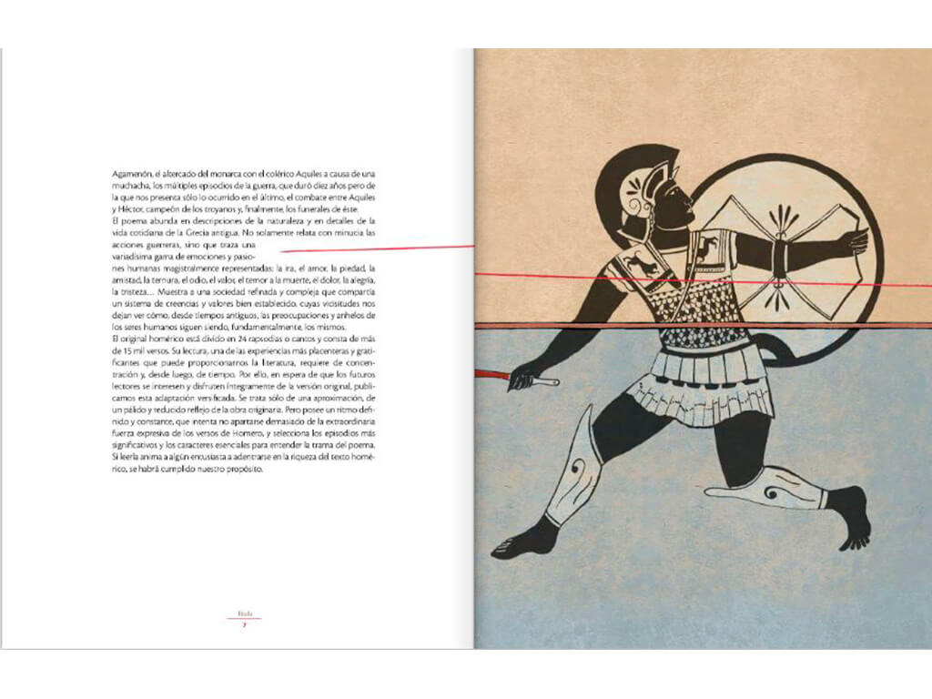 Primer gran poema de la literatura occidental que narra episodios de la guerra entre griegos y troyanos, a causa de Helena, en un tiempo en el que los dioses se mezclaban en los asuntos de los hombres. Es un libro ilustrado que pretende acompañar los versos con ilustraciones que ofrezcan un mayor entendimiento de un texto que en ocasiones resulta confuso.