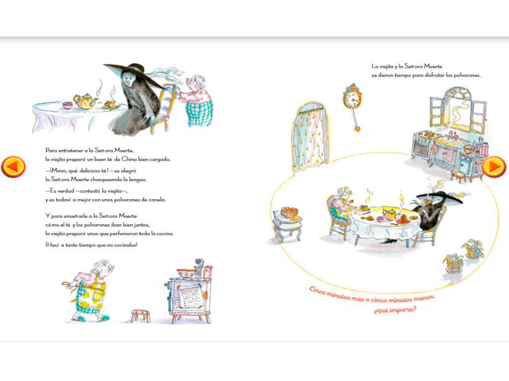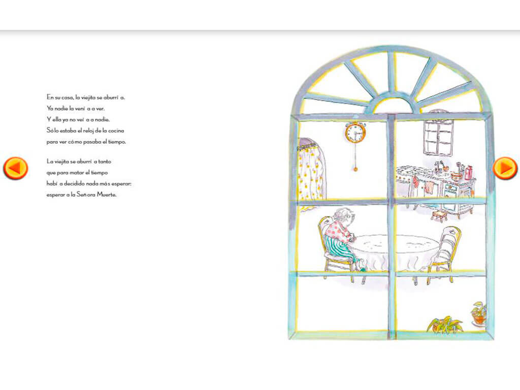 En su casa, la viejita se aburría. Ya nadie la venía a ver y ella ya no veía a nadie. Sólo estaba el reloj de la cocina para ver cómo pasaba el tiempo. Un día se aparece la Señora Muerte y todo cambia.