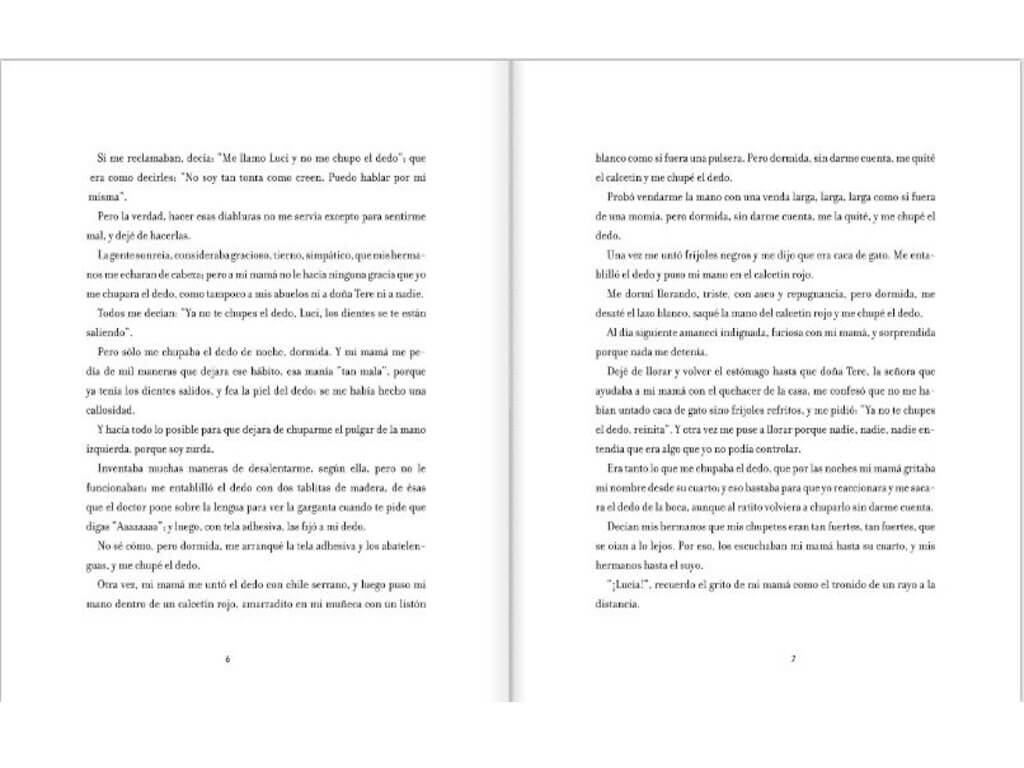 Luci narra los diversos intentos que hizo para dejar de chuparse el dedo. Sus hermanos se burlaban de ella, su mamá se enojaba y hacía mil cosas para detenerla, su nana le rogaba que ya no lo hiciera, pero no podía parar; el dedo iba a su boca sin que pudiera evitarlo y eso la llenaba de frustración. Muchos lectores verán aquí su reflejo y, en el mejor de los casos, también encontrarán una solución.