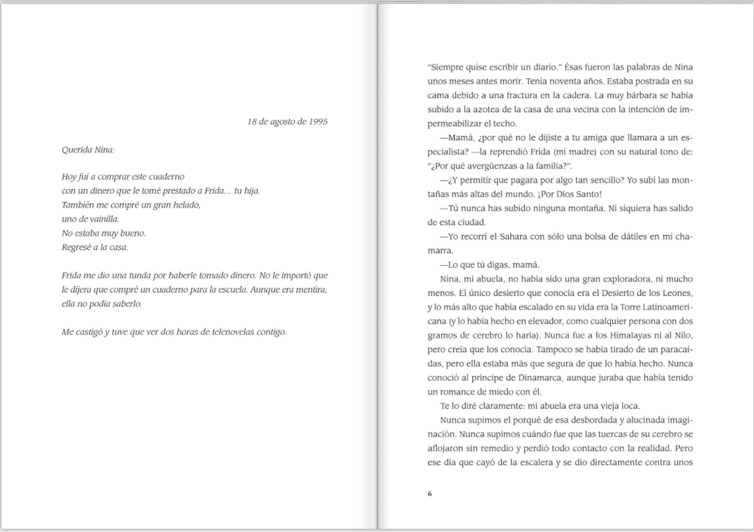 Los personajes de esta novela no son exactamente estereotipos. Nina, la abuela, no es la típica anciana dulce y cariñosa; a Claudia, la hermana, le gusta el futbol y tiene la rudeza de la que carece Eduardo, el protagonista, o ¿deberíamos decir la protagonista? Sí, Eduardo sabe que es una mujer en un cuerpo de hombre, así que escoge un nombre propio con el que sí se reconoce: Victoria. Esto y todo lo que le sucede es lo que le platica a su diario, que se ha convertido en un personaje más de esta historia.