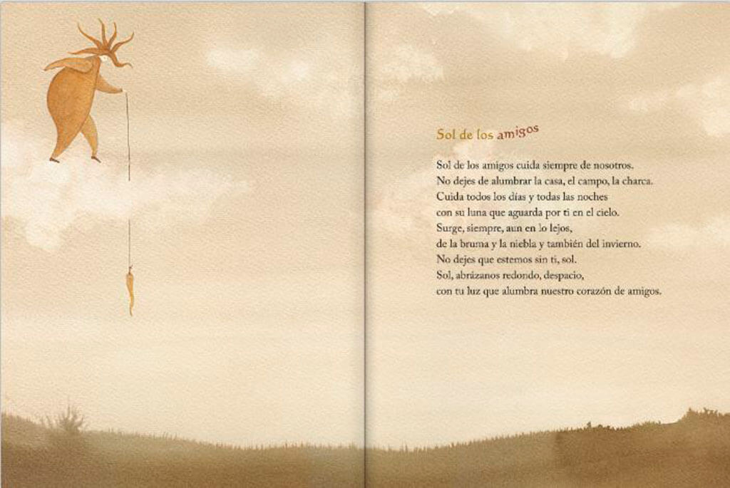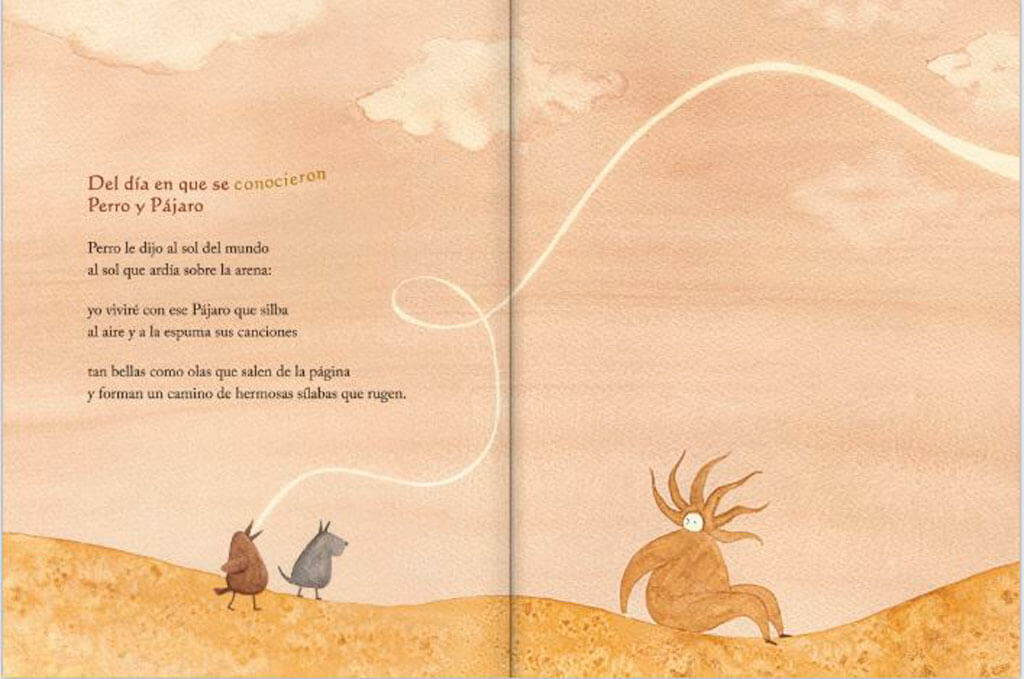 En este libro hay dos amigos: un perro y un pájaro que comparten muchas aventuras. Un día deciden hacer del mundo su casa, abren una ventana al cielo y todo cambia: el aire ruge, los árboles danzan, los caminos son ríos y un ladrido, el universo. Cada palabra es un juego y cada juego es un sitio para soñar que un amigo es la risa y el canto, el silencio y el mundo entero.