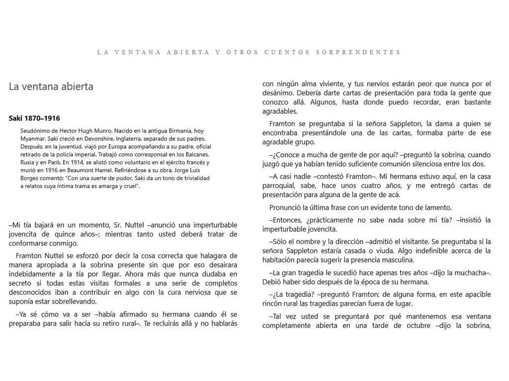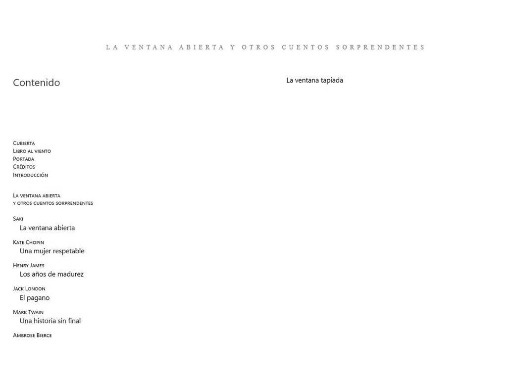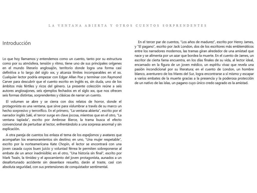 La presente colección reúne a seis autores anglosajones (Saki, Kate Chopin, Henry James, Jack London, Mark Twain, Ambrose Bierce), seis ejemplos fechados en el siglo XIX, que nos ofrecen seis formas distintas, sorprendentes y clásicas de narrar un cuento.