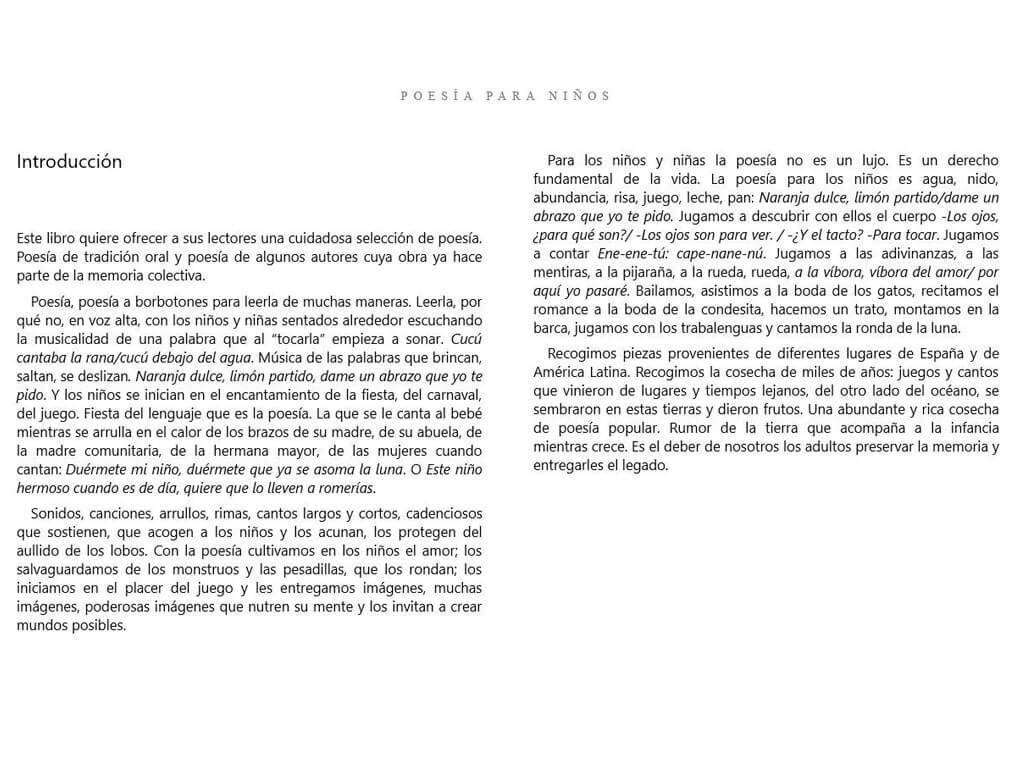 Ofrece una selección de poesía de tradición oral y de autores que ya están consolidados en la memoria colectiva. Contiene sonidos, canciones, arrullos, rimas, cantos largos y cortos, rondas y trabalenguas de España y América Latina.