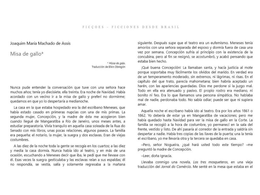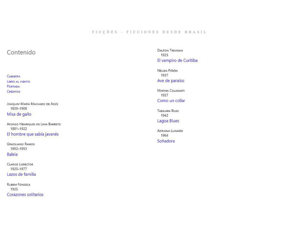 Esta título es una edición conmemorativa por la invitación a Brasil como país invitado a la 25° Feria Internacional del libro de Bogotá 2012. Los escritores seleccionados fueron: Joaquim María Machado de Assís Afonso Henriques de Lima Barreto Graciliano Ramos Clarice Lispector Rubem Fonseca Dalton Trevisan Nélida Piñón Marina Colasanti Tabajara Ruas Adriana Lunardi