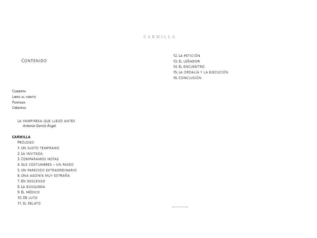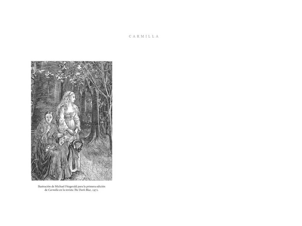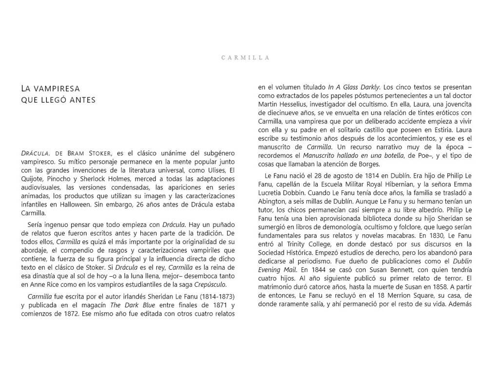 Relato escrito 26 años antes que Drácula, y considerado uno de los más importantes en el subgénero vampiresco. Narra la historia de Laura, una jovencita de diecinueve años, envuelta en una relación de tintes eróticos con Carmilla, una vampiresa que por un deliberado accidente empieza a vivir con ella y su padre en el solitario castillo que poseen en Estiria.