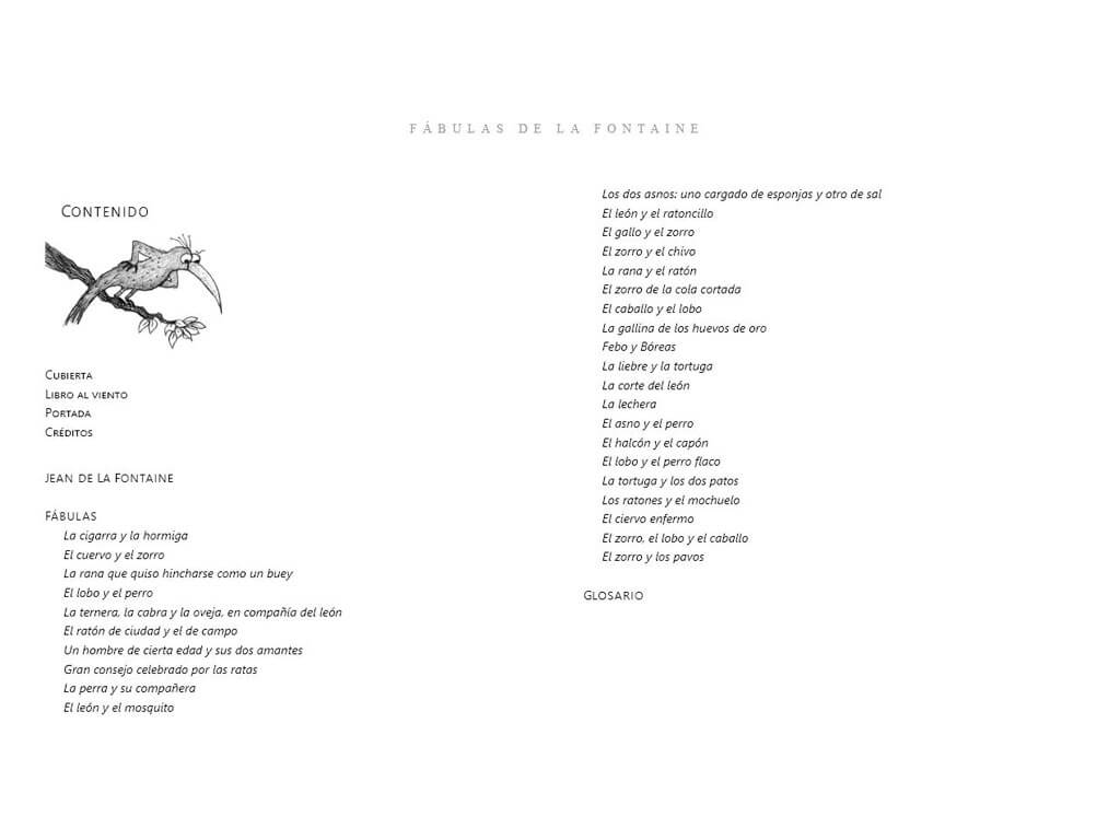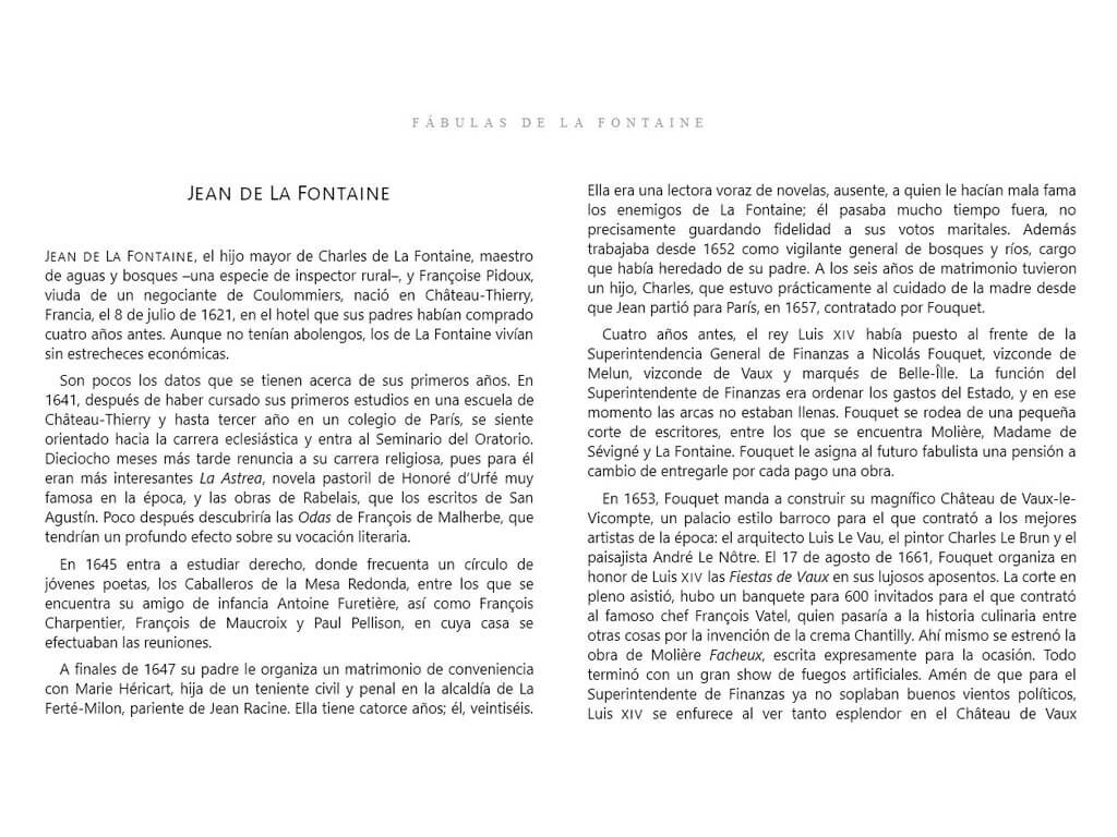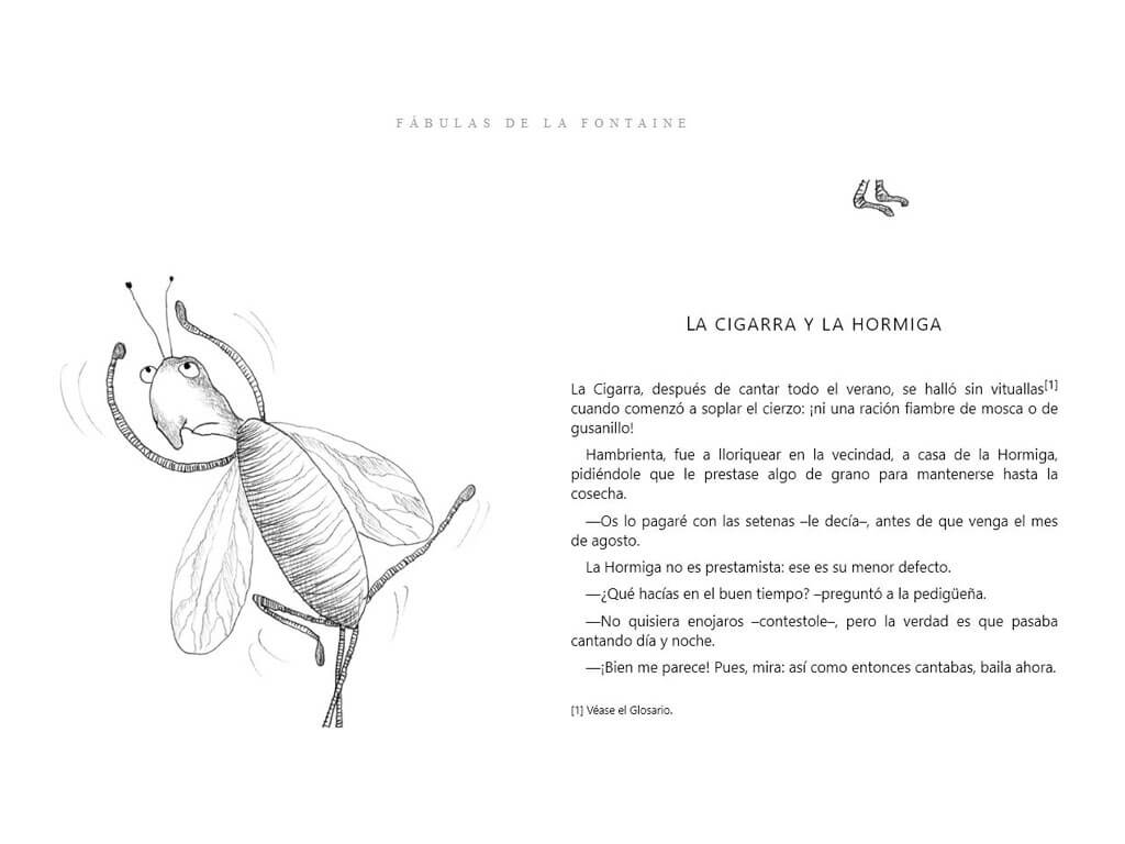 Título especial para niños y niñas, con una selección de 35 fábulas del escritor francés Jean de La Fontaine (1621 - 1695). Contiene ilustraciones y son protagonizadas por diversos animales, brindando variadas enseñanzas.