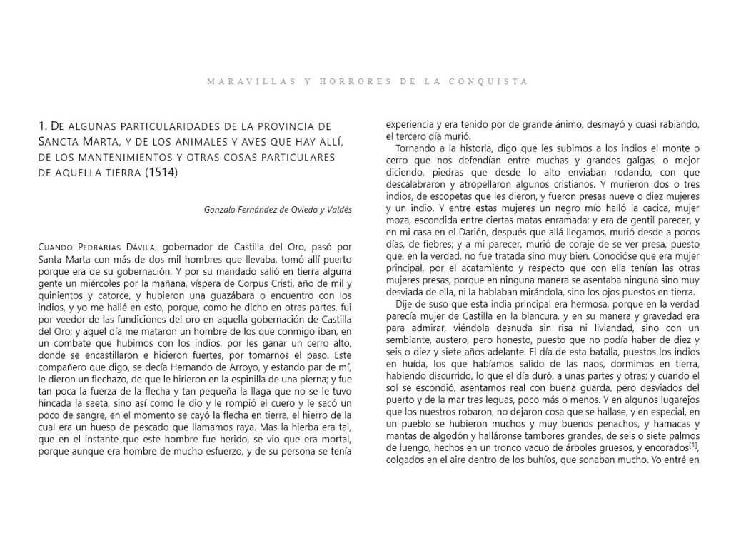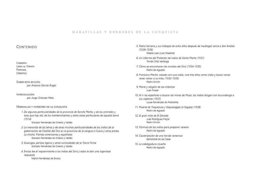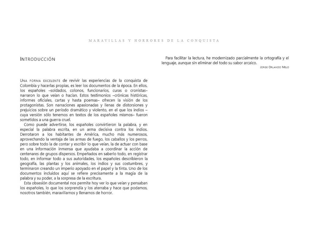 Incluye una selección de textos reunidos originalmente por el historiador Jorge Orlando Melo en dos volúmenes. En estos textos, los españoles narraron lo que veían o hacían, en testimonios con distorsiones y prejuicios sobre un período dramático y violento, en el que los indios fueron sometidos a una guerra cruel.