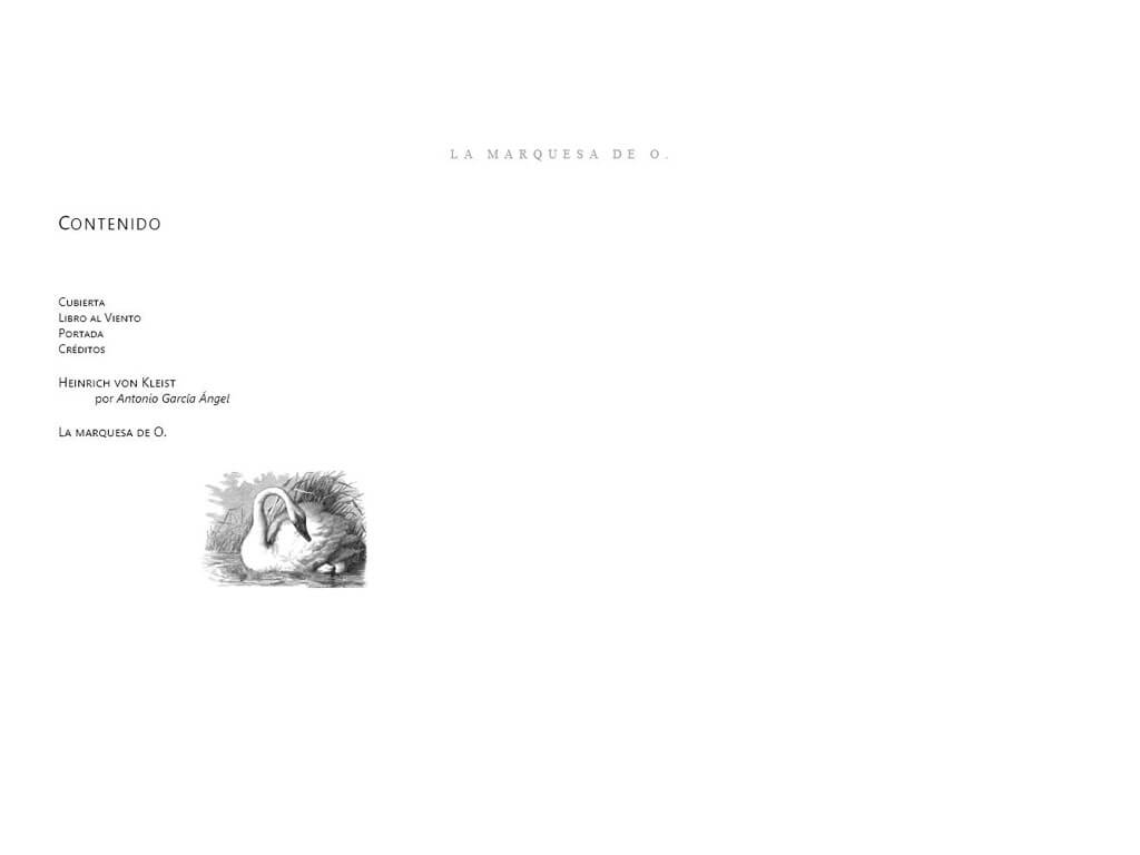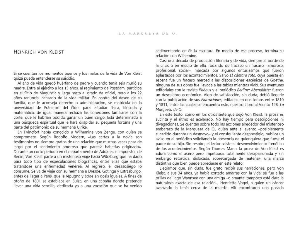 Cuenta la historia de una joven viuda que vive en una ciudad al norte de Italia con su padre. En medio de las guerras napoleónicas, la ciudad es tomada por el ejército ruso, la marquesa está a punto de ser violada por unos soldados pero es rescatada por un coronel del ejército invasor. Meses después, la marquesa descubre que está embarazada, aunque no ha conocido varón, y busca al padre de la criatura. La obra fue ganadora de la beca de traducción Idartes 2017.