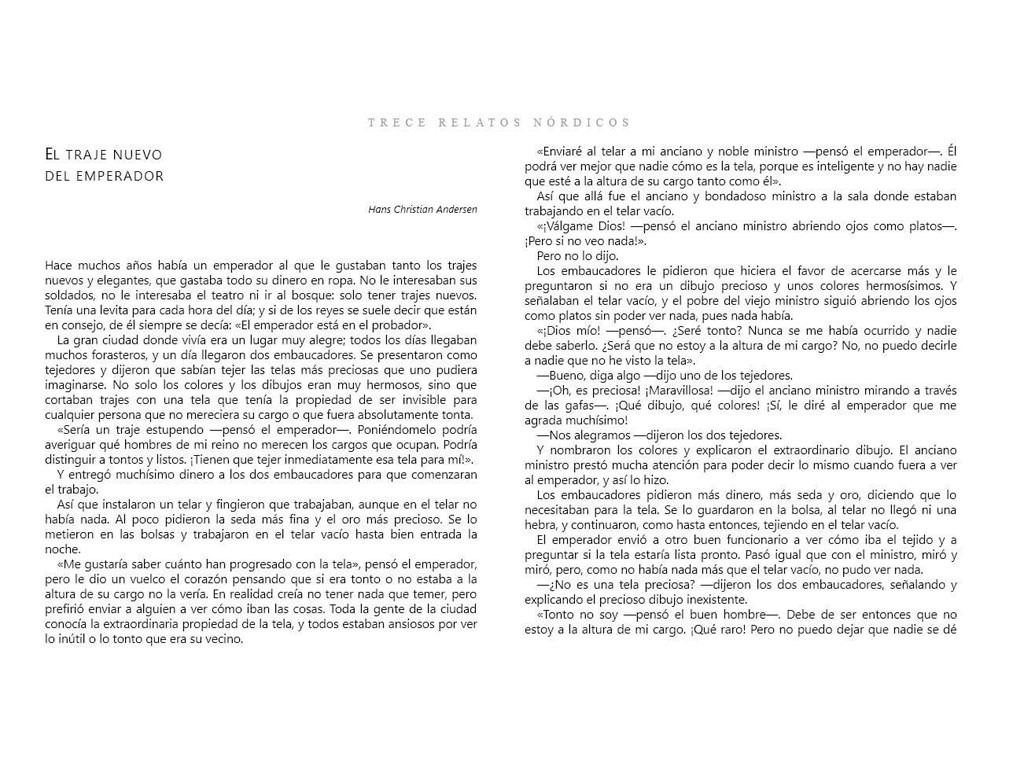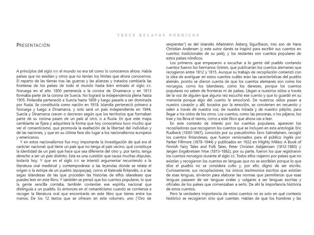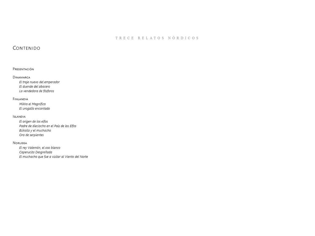 Reúne trece relatos tradicionales de los cinco países nórdicos —Dinamarca, Finlandia, Islandia, Noruega y Suecia—. En representación de Dinamarca, hay tres cuentos de Hans Christian Andersen, un clásico de la literatura infantil. Por parte de Finlandia, dos historias para niños que adaptó Parker Fillmore. De Islandia, por un lado hay tres cuentos tradicionales —que incluye una versión del origen de los elfos— y un relato dirigido a un público juvenil. Los relatos tradicionales de Noruega son “El rey Valemón, el oso blanco”, “Caperucita desgreñada” y “El muchacho que fue a visitar el Viento del Norte”. Es en suma una selección diversa que, por un lado, muestra la vigencia y aporte de la literatura de los países del norte de Europa y, por el otro, destaca su lugar privilegiado en el ámbito de la literatura infantil y juvenil.