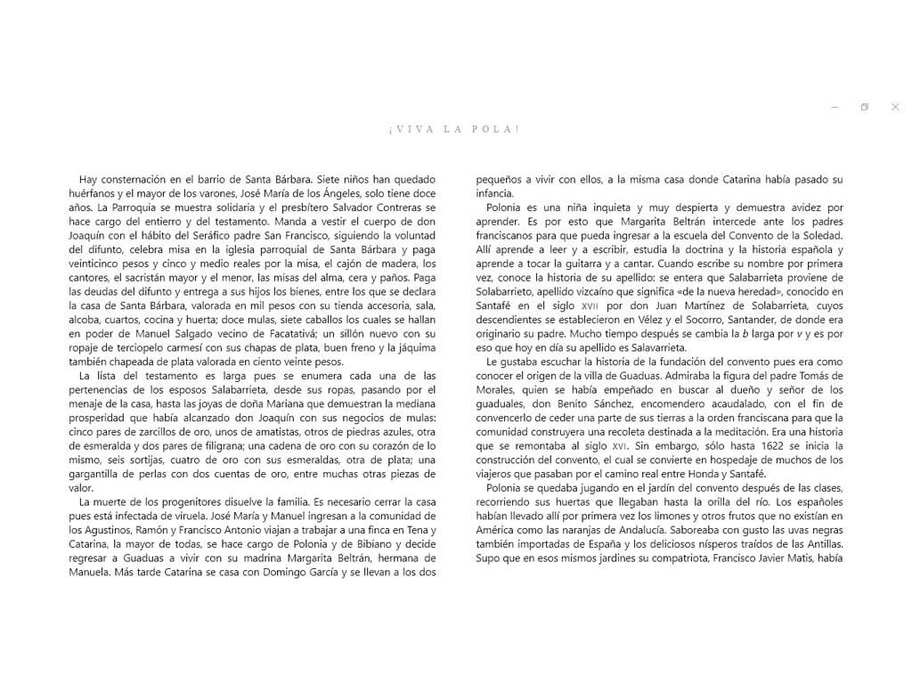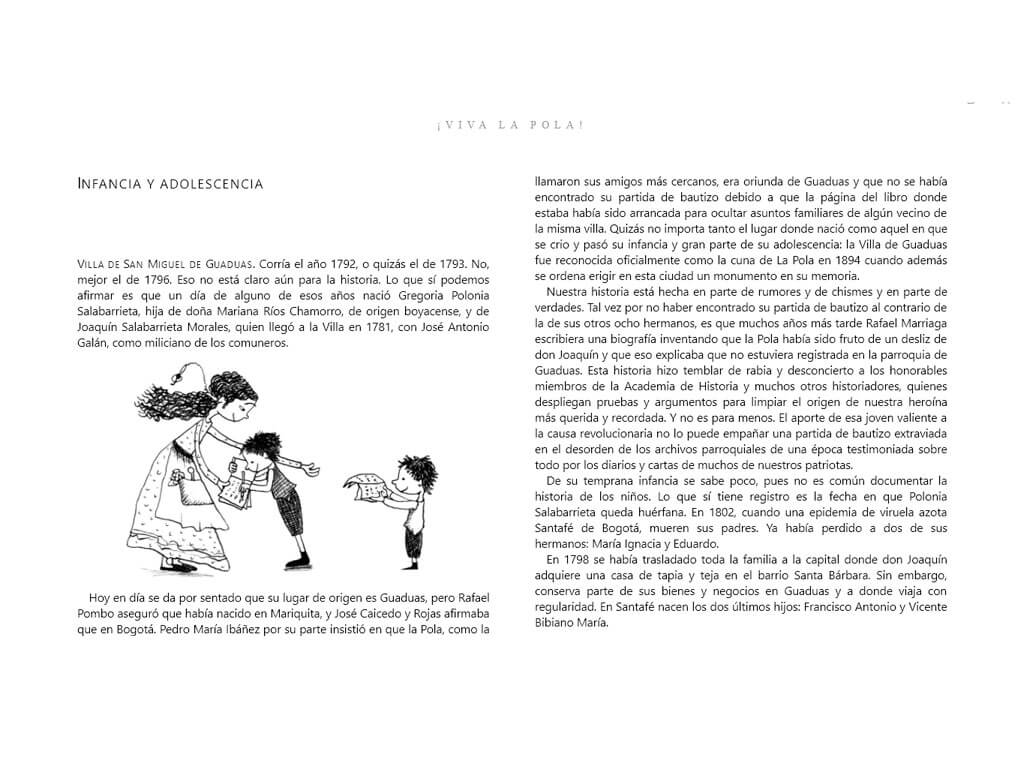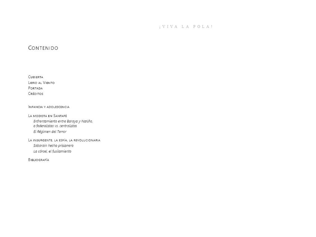 Biografía de Policarpa Salavarrieta, llamada comúnmente La Pola, un personaje sobresaliente en la historia de Colombia por su condición de revolucionaria, mujer valiente y comprometida con una causa, en un momento histórico donde el papel de las mujeres era por lo general pasivo y sumiso. El libro hace énfasis en la personalidad y sensibilidad femenina frente a la causa revolucionaria y patriota.