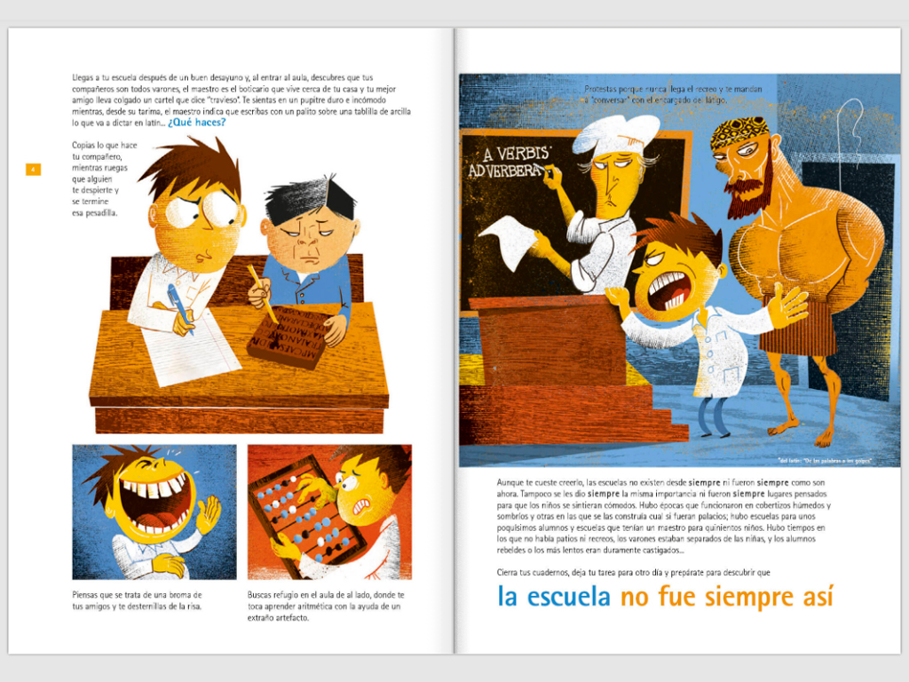 Un entretenido paseo por la historia de la educación, que rememora los tiempos en que la escuela era un privilegio para pocos, los niños usaban orejas de burro, las mujeres no podían enseñar, los zurdos debían escribir con la mano derecha y no existían los recreos. Una visión diferente de la historia, que promueve la identidad grupal y el respeto por la diversidad.